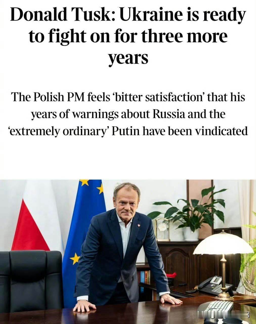 波兰总理图斯克表示,乌克兰准备再战斗2到3年。 图斯克说,泽连斯基告诉他,乌克兰准备与俄罗斯继续打两到三年,但担心战争可能会持续十年。