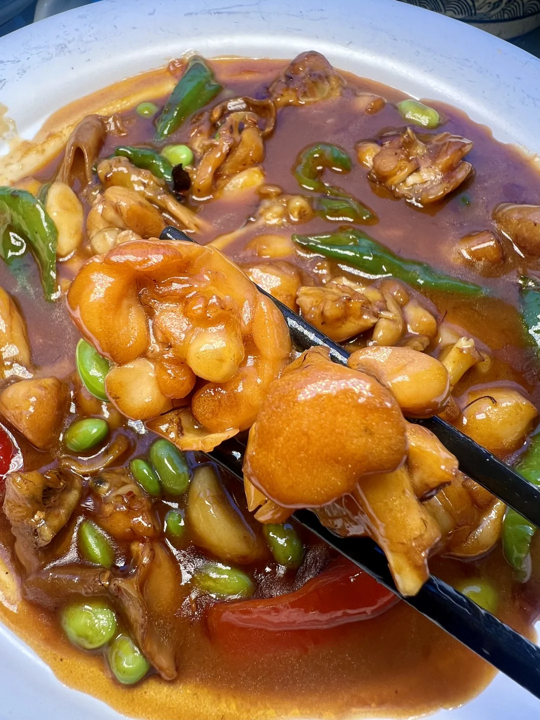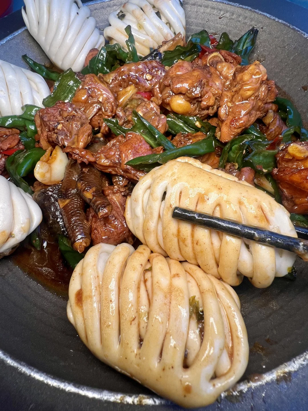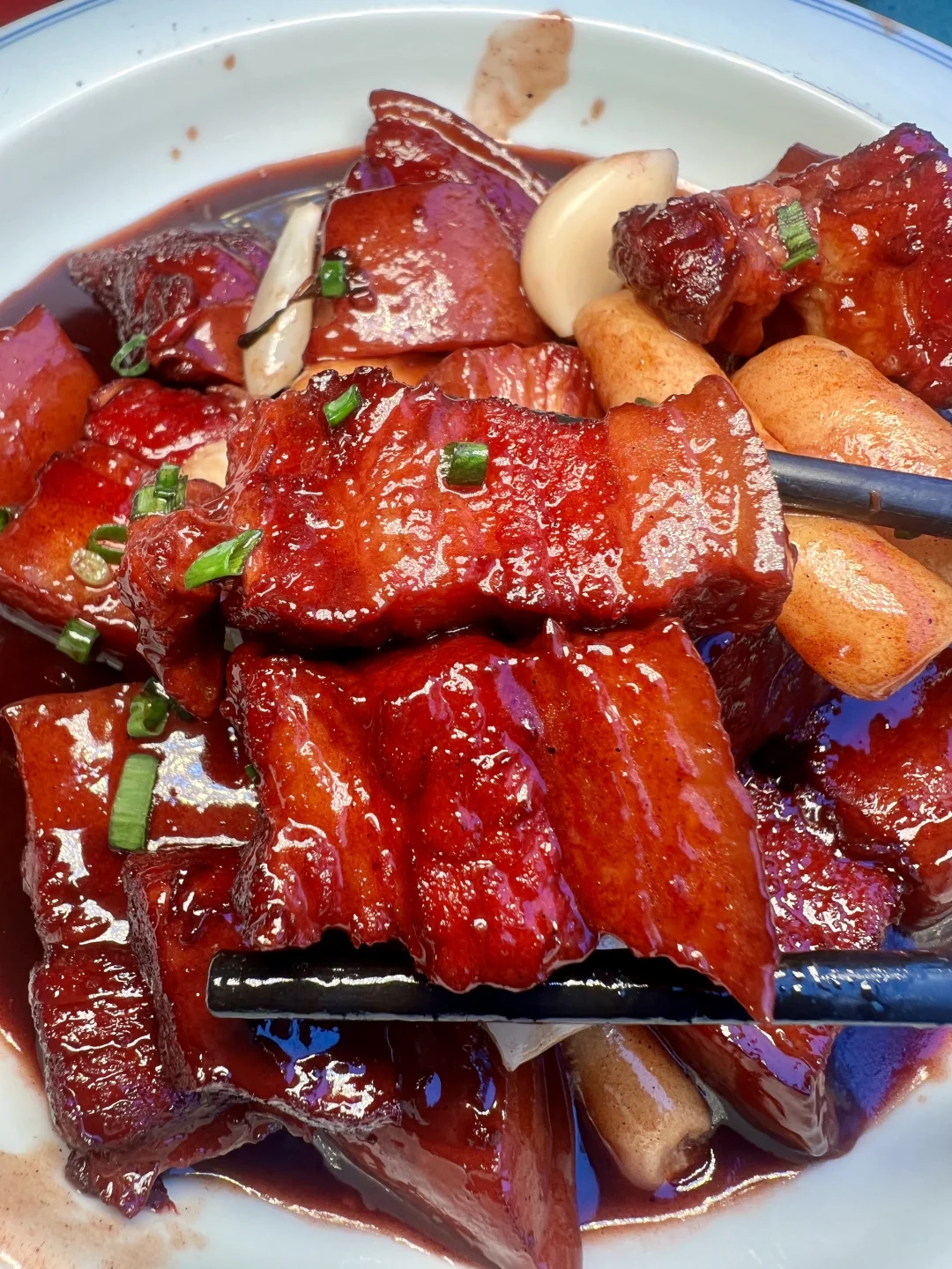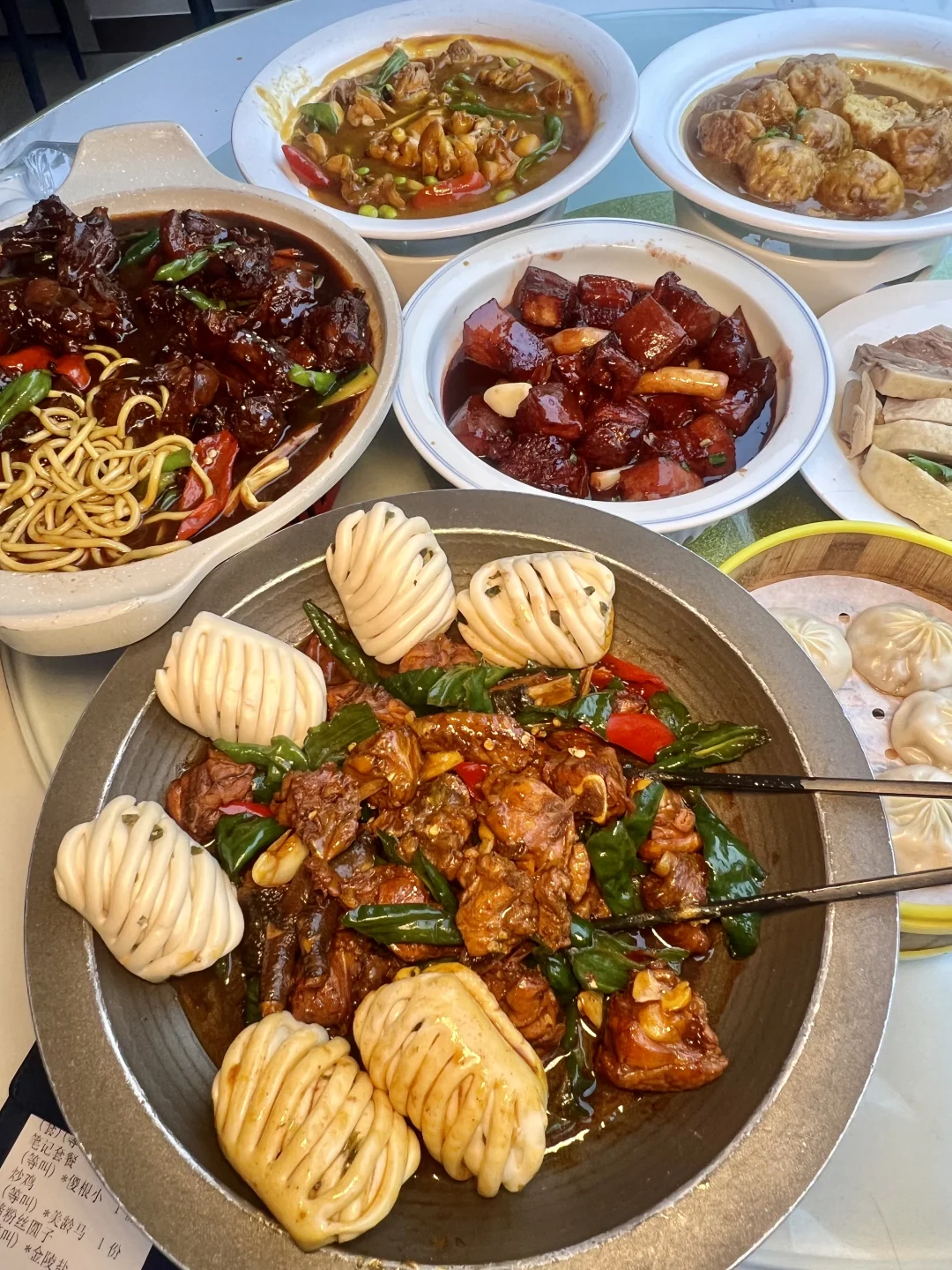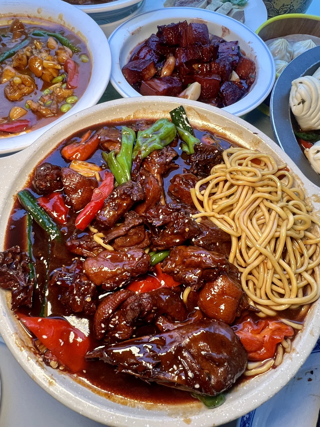 锁金村[搜索高亮]真的被低估了…不是本地朋友带路真不知道原来这里好吃的这么多!! 小炒鸡一定要点,汤汁浓郁,鸡又嫩又入味,贴的花卷蘸汤别提多香了🥹 还有黑鸭煲!甜辣口的,里面加的面条裹满汤汁好吃的要命! 年糕红烧肉害得我吃了两碗饭!红烧肉肥而不腻入口即化,瘦肉也完全不柴,年糕糯叽叽的特别入味