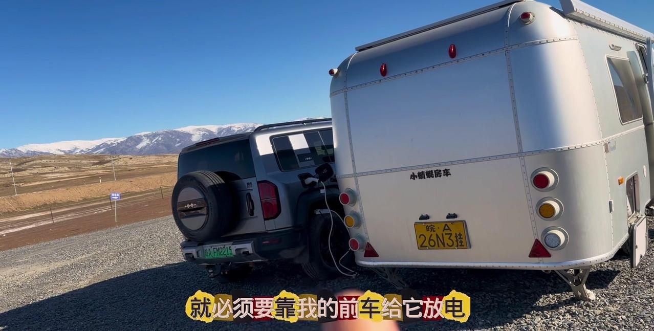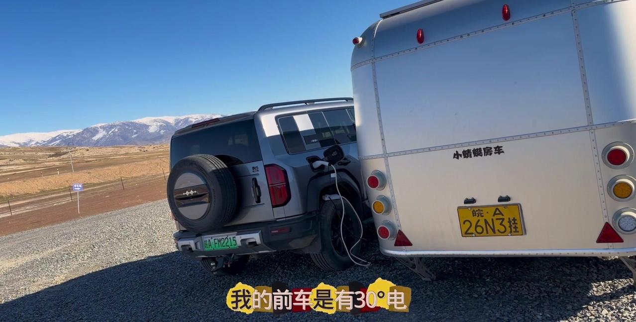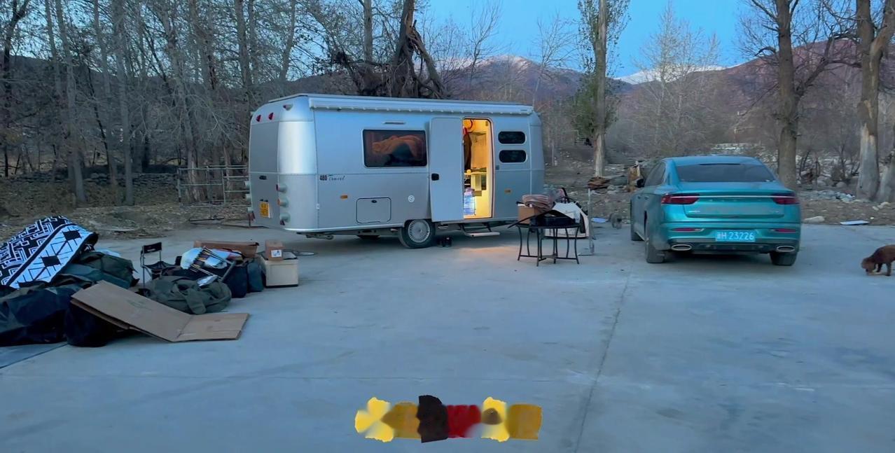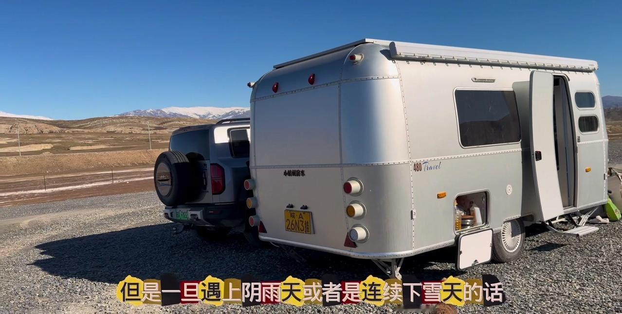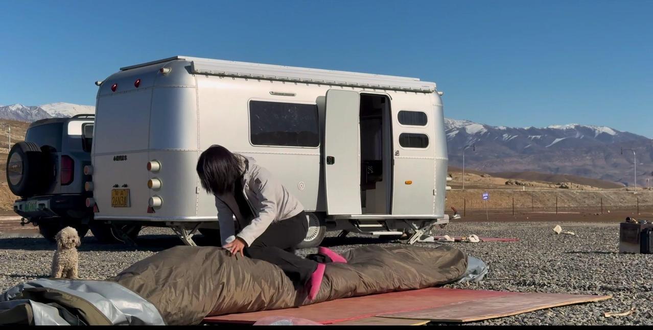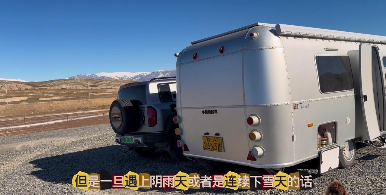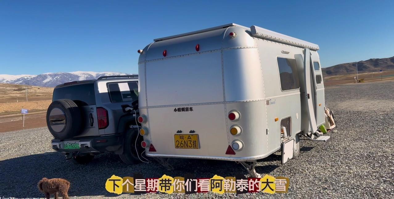 一个本地人的警告,让我在阿勒泰的房车美梦24小时内破碎。这个营地是我来新疆后最满意的,每天推窗见雪山日出,傍晚看日落,夜晚还有漫天星星。但老乡说下星期要下暴雪,雪深一米多,路会封死,补给成问题。 01听劝搬家 其实我这是第4次搬家了,希望这次是最后一次。收拾东西花了1个多小时,后备箱塞满砖头,车顶拉着板子,像个移动的小货车。 02房车充电 很多人好奇拖挂房车怎么充电,我车顶有1200瓦太阳能板,大晴天足够用。阴雨天或下雪天,就靠前车30度电供电,昨天电用完了,今天正在放电。 安全第一,主打一个听劝。