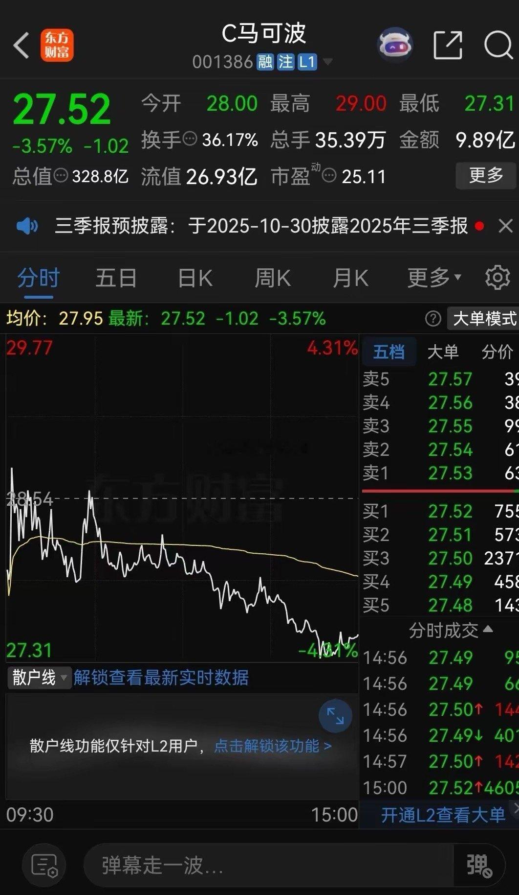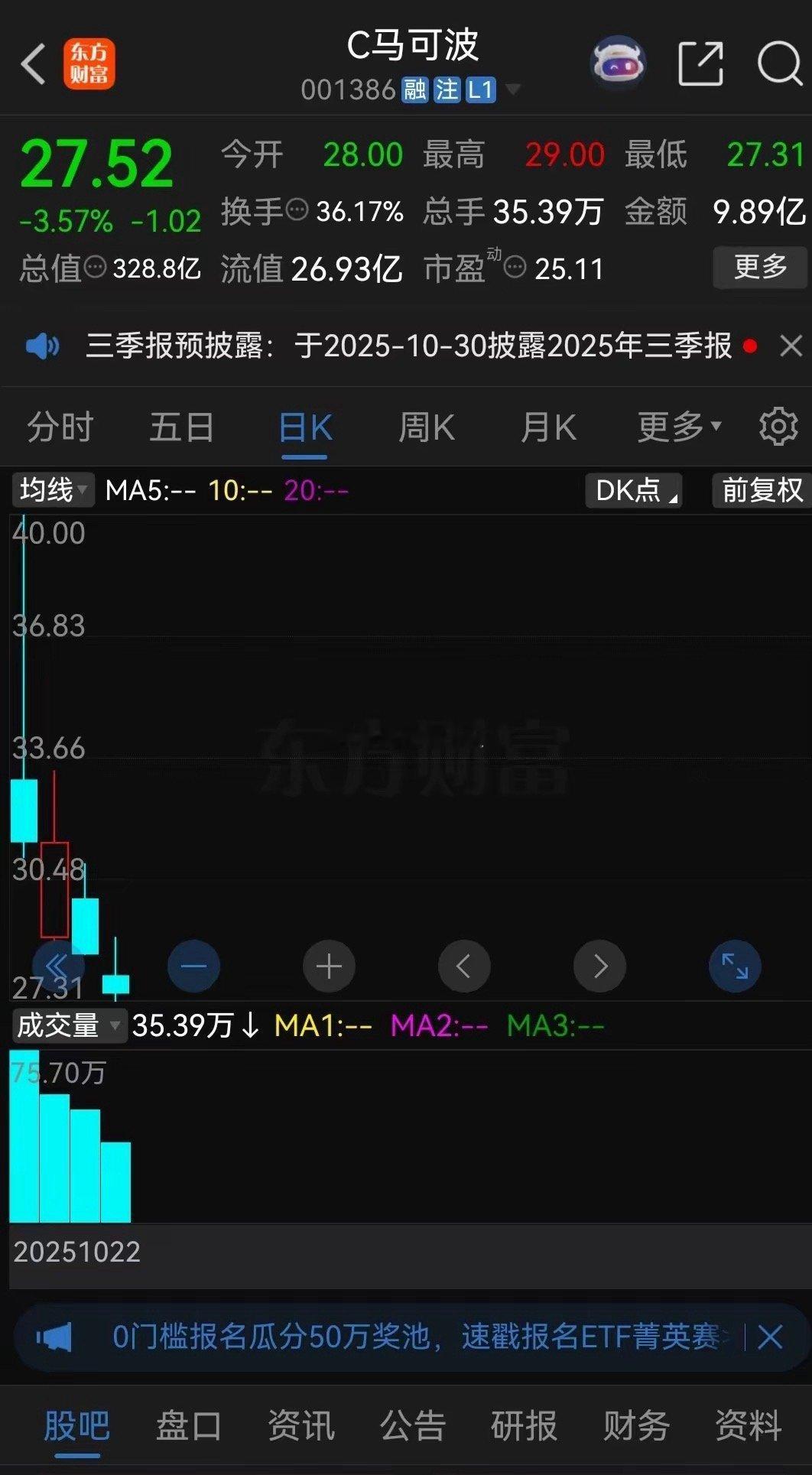 马可波罗上市四天,每天都在创新低,今天盘中最低跌到了27.31元,收盘股价报收于27.52元,下跌3.57%。目前已经较上市首日高点下跌了32%,可以说这四天进场的股民,拿到现在全部被套,无一幸免。