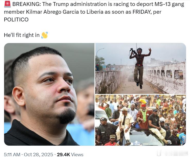 特朗普政府计划最早在本周五将“MS-13”帮派成员基尔马尔·阿布雷戈·加西亚驱逐至利比里亚。