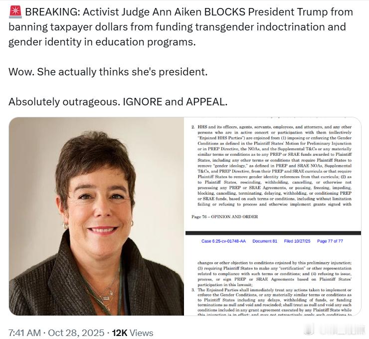 民左党激进法官安·艾肯阻止了特朗普总统禁止使用纳税人的钱资助教育项目中的“跨性别灌输”和“性别认同”内容。