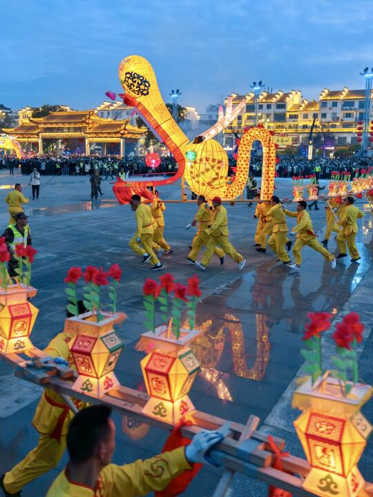 约160人共同抬起100节相连的板凳🐉穿越街头巷尾