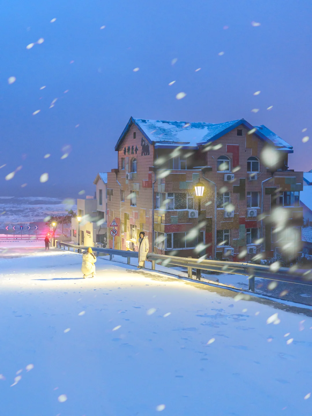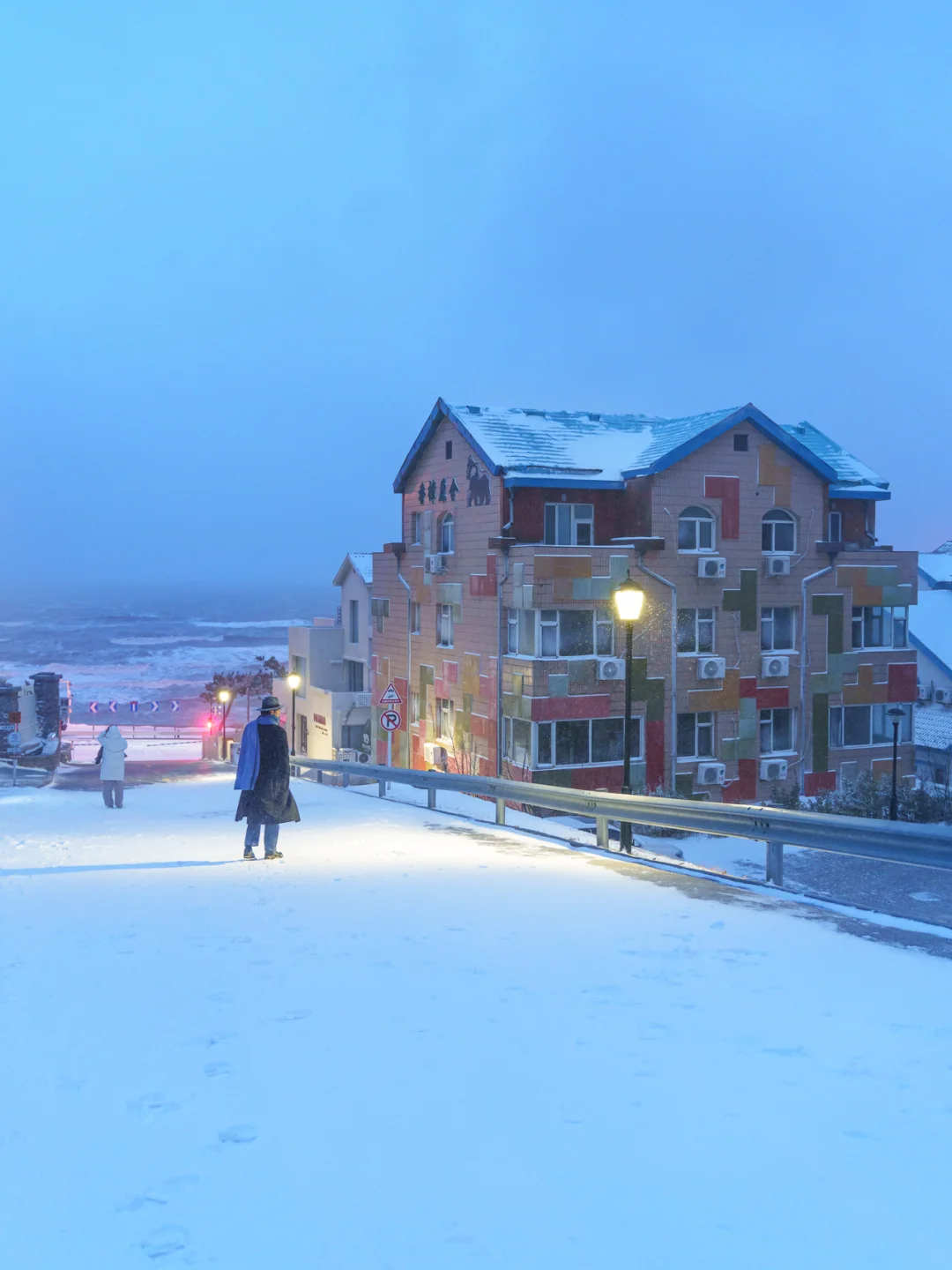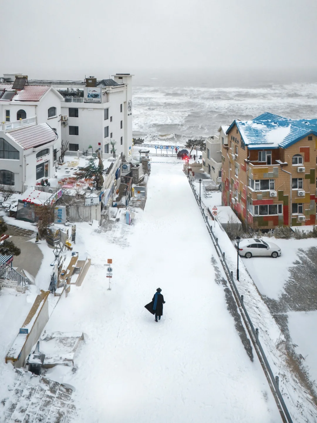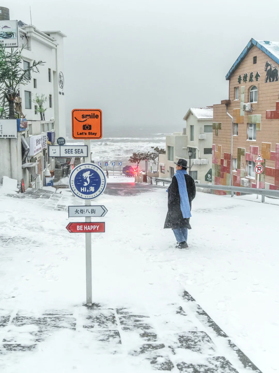 凌晨的火炬八街 没有白天络绎不绝的游客 只有被茫茫白雪覆盖的安静街道 从火炬八街一路走到海边沙滩 下雪的城市果然会更浪漫一些 -