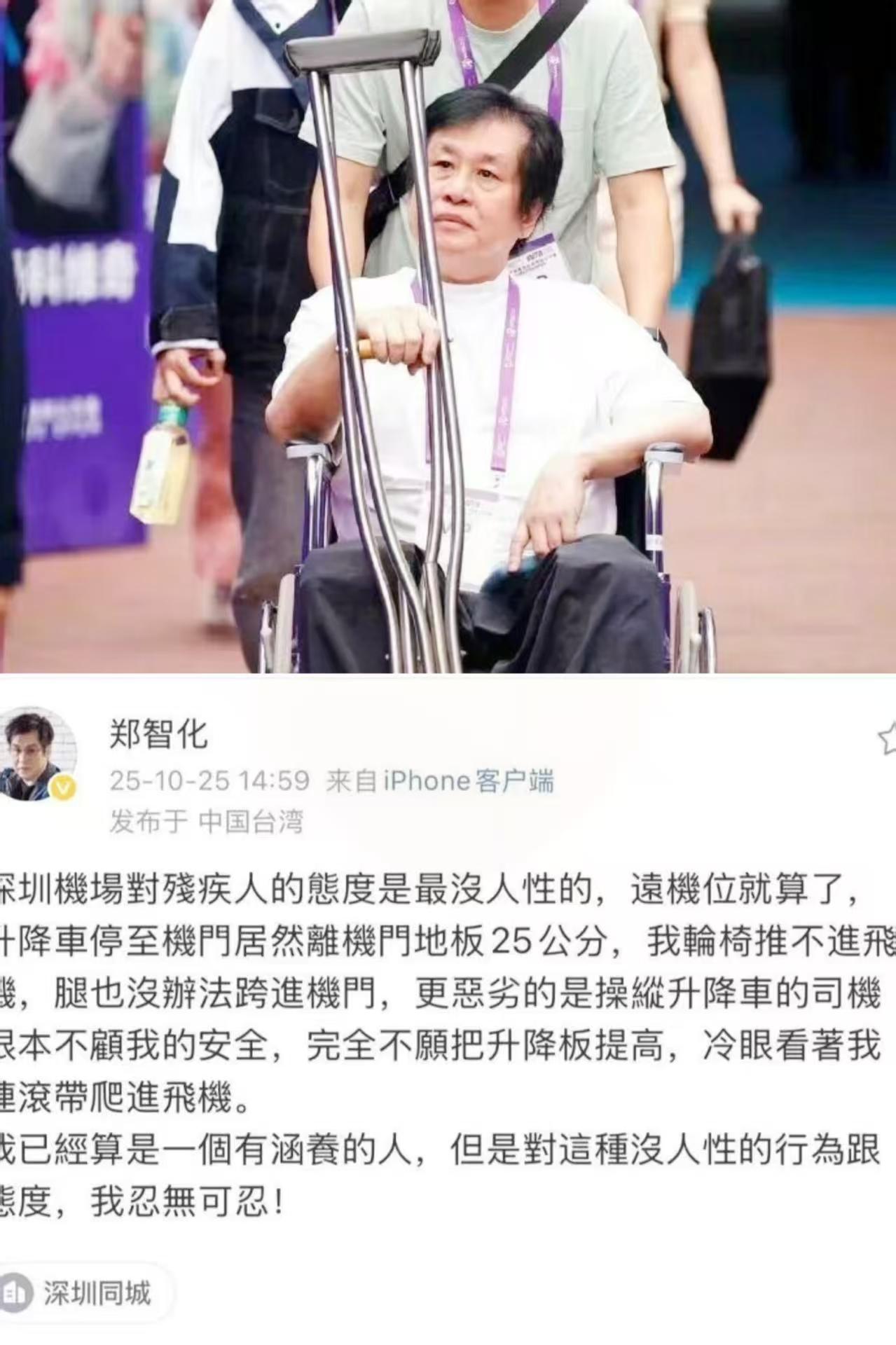 郑智化登机遇到不顺,形容当时的情景用“连滚带爬”上了飞机,没想到后来被机场监控打脸了。 原来全程推轮椅的两位小哥一直都在旁边,形容时用“连滚带爬”,似乎并没有把人家服务好的功劳说清楚,舆论也是一边倒地批评郑智化。后来郑智化出来道歉了,说那是气话,感谢两位小哥贴心周到的服务,不想影响他们的工作和名声。 这事儿告诉我们说话要考虑周全点,不要让好心好意的人受委屈啊。 图片来源网络,侵权即删