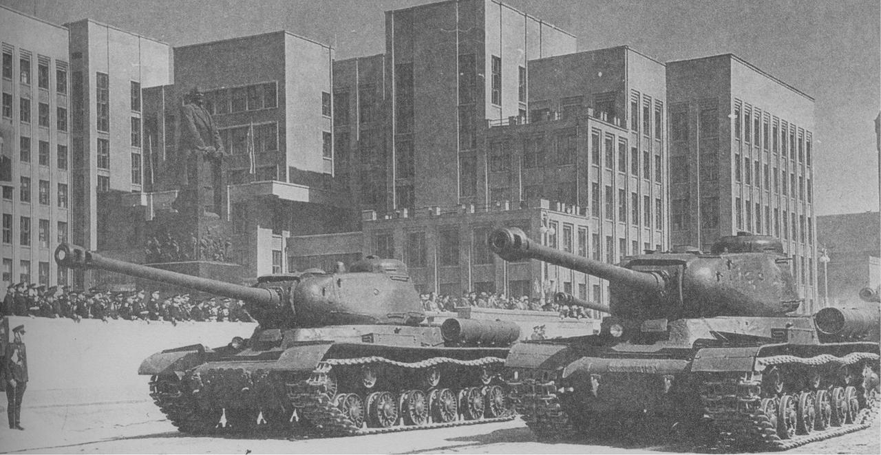 比较少见的 IS-2 重型坦克(“约瑟夫·斯大林”2式)——1948年5月1日,明斯克,五一阅兵式现场。IS-2 重型坦克正在驶过主席台。大家注意,画面右侧的那一辆 IS-2 重型坦克配备安装了“德国式”的炮口制退器,属于二战期间最早生产的 IS-2 初期型号。 IS-2 重型坦克是以苏联领导人约瑟夫·斯大林命名的重型坦克,配备122毫米D-25T坦克炮,正面装甲厚达120毫米。 ”德国式炮口制退器“是苏联借鉴德国豹式等坦克的炮口制退器而设计的双室式制退器(参见图2~3),可减少40%后坐力,后改为更高效的自研型号。
