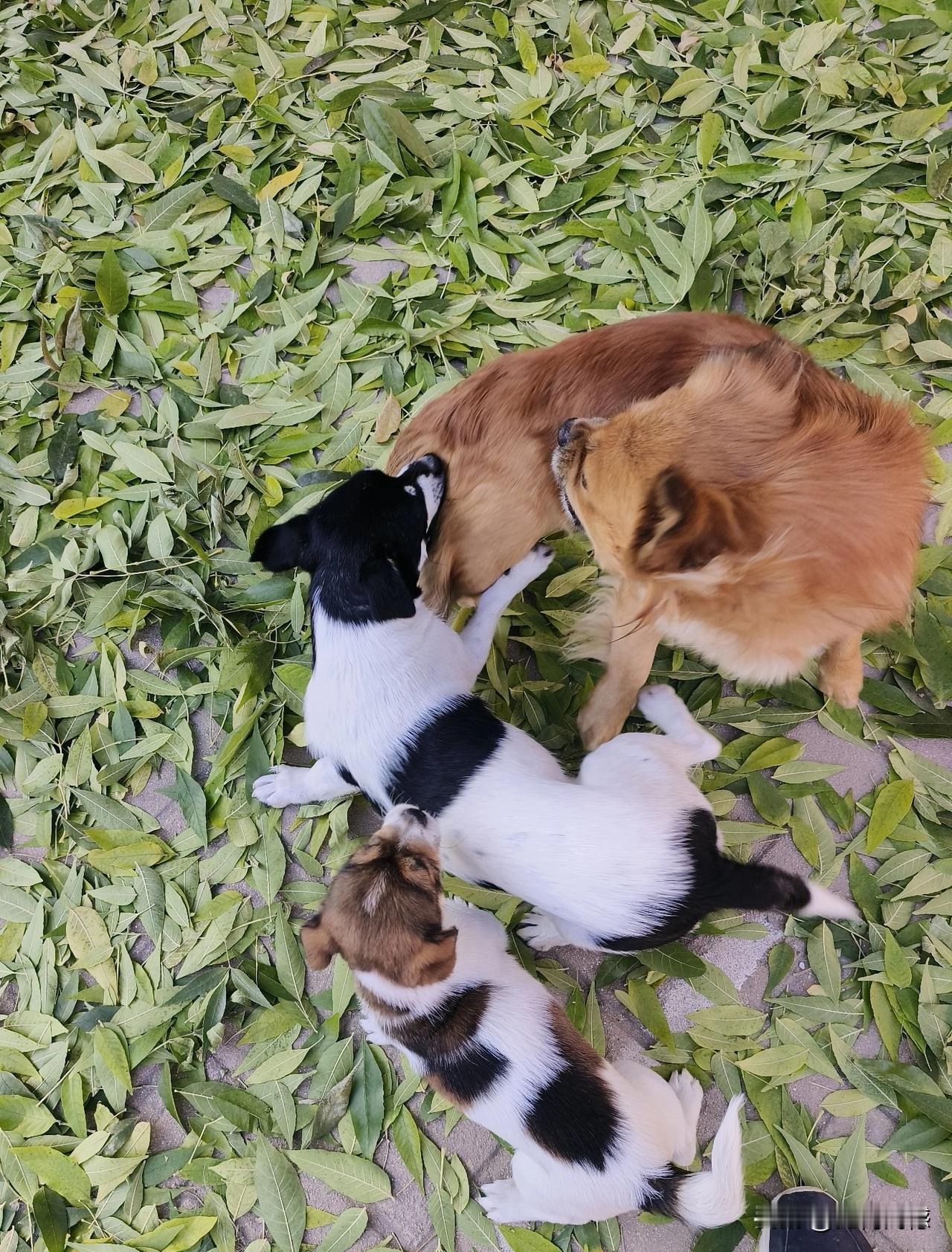 小狗不怕大狗,两条小狗一合作,大狗招架不住,急得在落叶上团团转,看起来非常的好看!