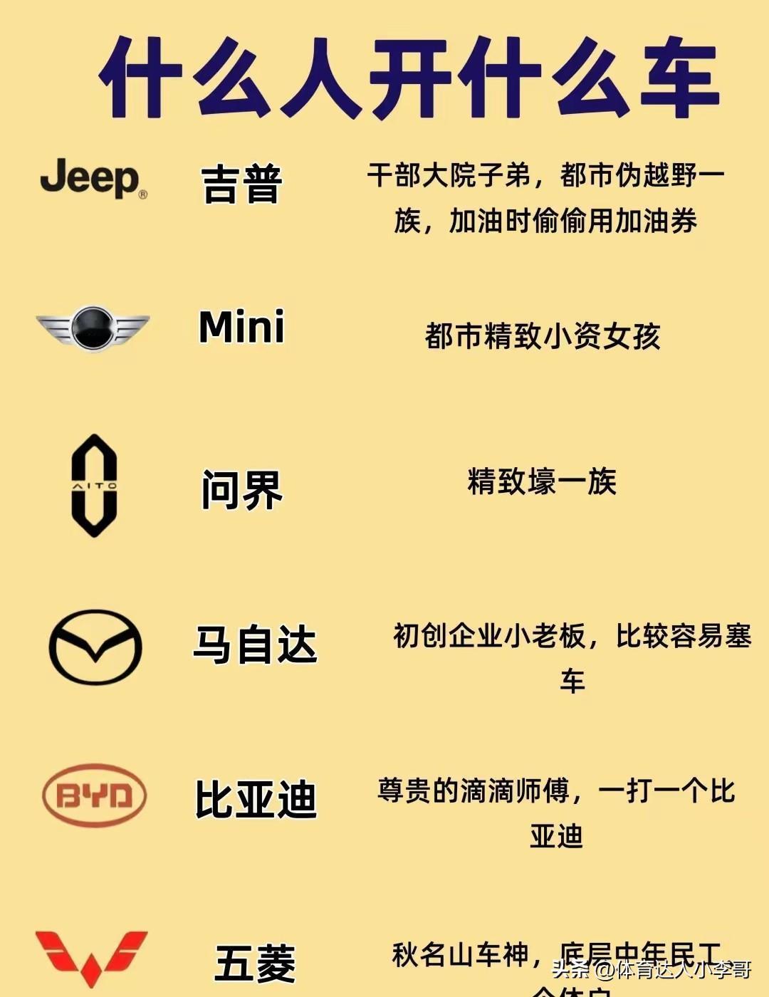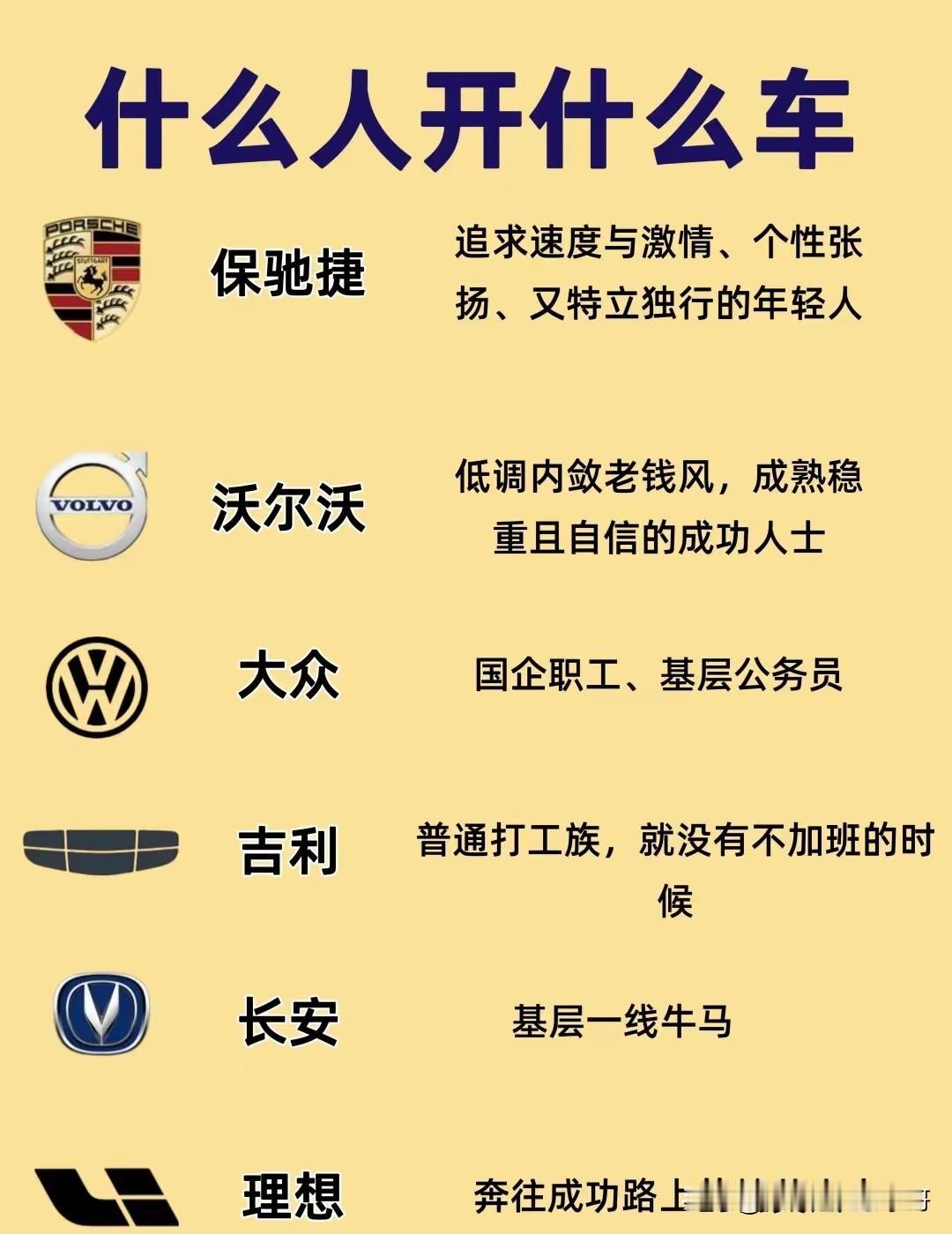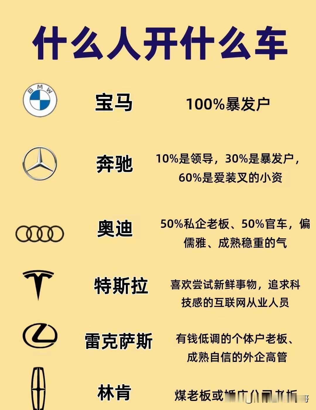 开什么样的车也彰显了你一定的身份,像我们看到一些开宝马的朋友啊,就知道喜欢开宝马的一般都是年轻人,而且以暴发户居多,开奔驰的相对来说比较小资,有一部分是暴发户,也有一部分是领导,还有一部分是比较相对来说比较沉稳的一组,而开奥迪的呢有很多是非常低调的,你根本看不出人家的深浅,也有可能是官方的领导,因为以前的话这个奥迪车的话本来就是官方用车,后来只是被我们国产车所取代了而已,还有一些喜欢开保时捷的,一看就是比较喜欢精致的生活,喜欢开这些新能源的像问界一看都是精致豪车,喜欢开五菱车的,一看都是装修的或者农民工的,喜欢开哈弗H6的话都是刚刚富裕起来的啊,包括一些吉利汽车呀,都是打工一族!不知道你开什么车,然后也不知道和你的身份是不是正好match,正好相对!