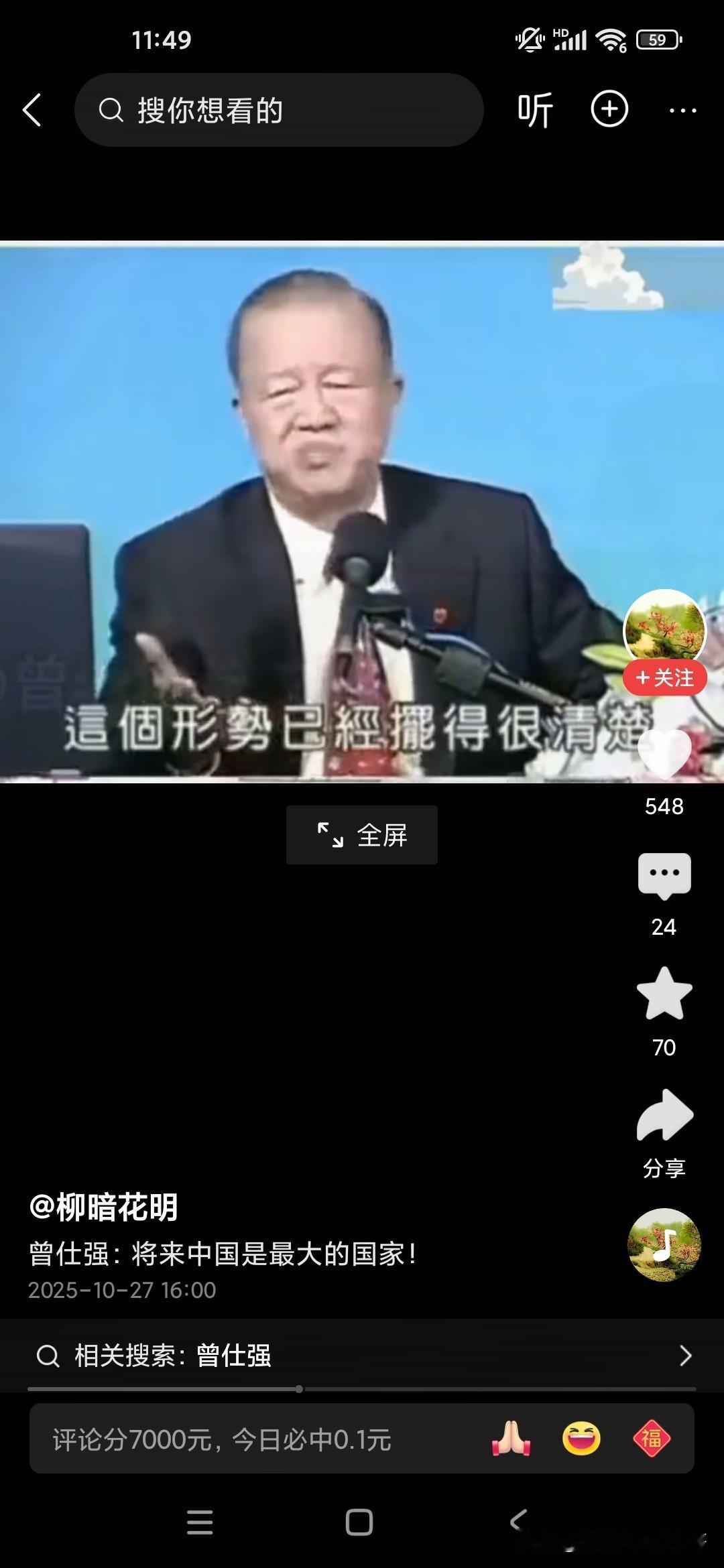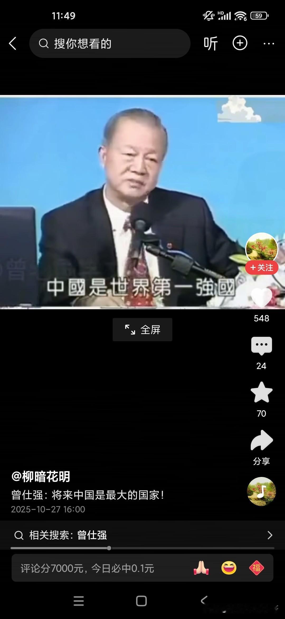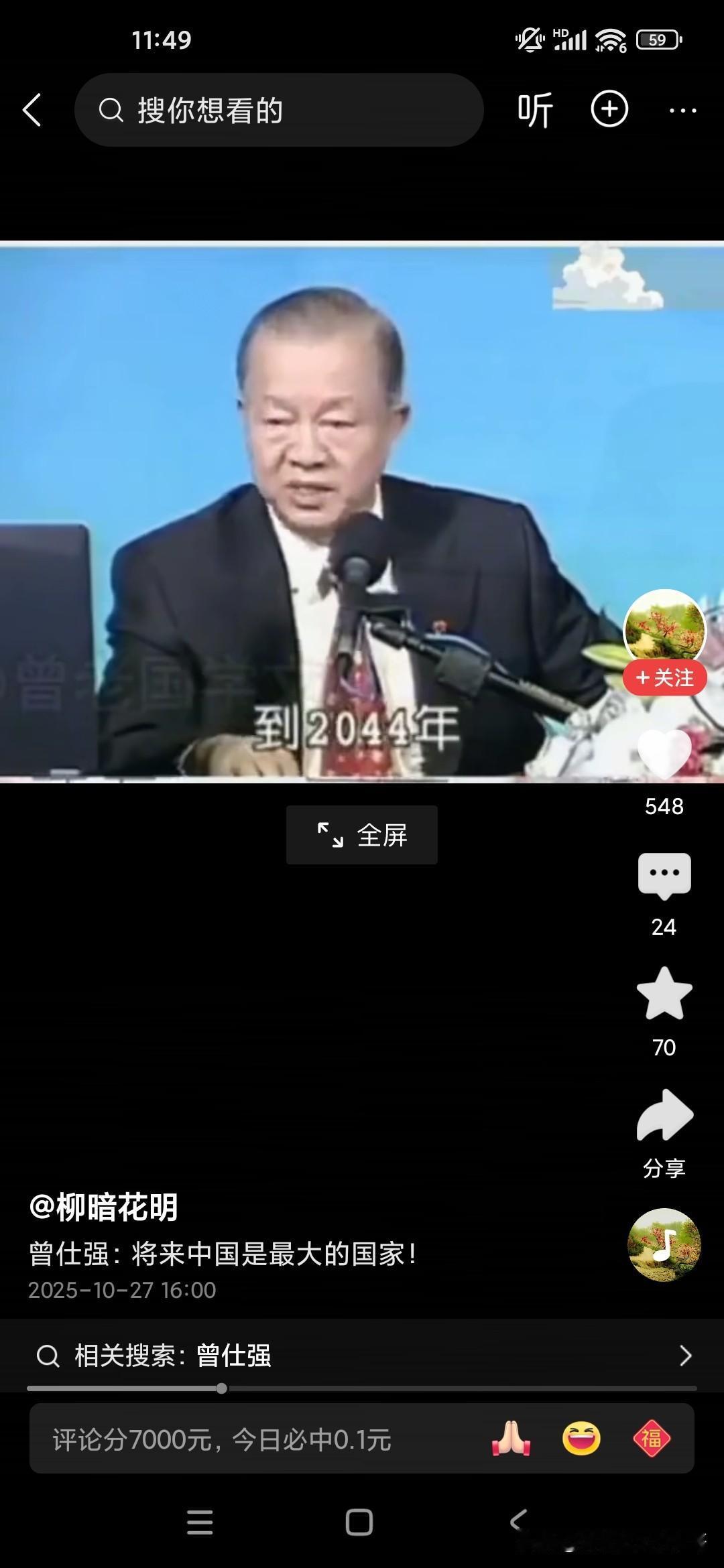 曾仕强先生曾经在早期的视频中预约到了2044年中国会成为世界第一,这个形式是明摆着千万不要怀疑曾老的预言,他说的很多预言都实现了,我算了一下,我的年龄到2044年可能都快60岁了,那时候即将退休,如果是能看到祖国强大到如此的地步,我肯定会非常开心的,我根本没有这个想过,尤其是在上世纪90年代我上小学的时候,那时候呃就是我讲的课本就是说早到2020年把中国建立成一个美丽,富强,富饶的一个国家,但是没有想到这么快就实现了,而且我们还打算在2035年达到中等发达国家,2014年,我觉得我相信我们中国人的智慧,我相信我们领导人的集体智慧,这个目标应该很快就能实现!