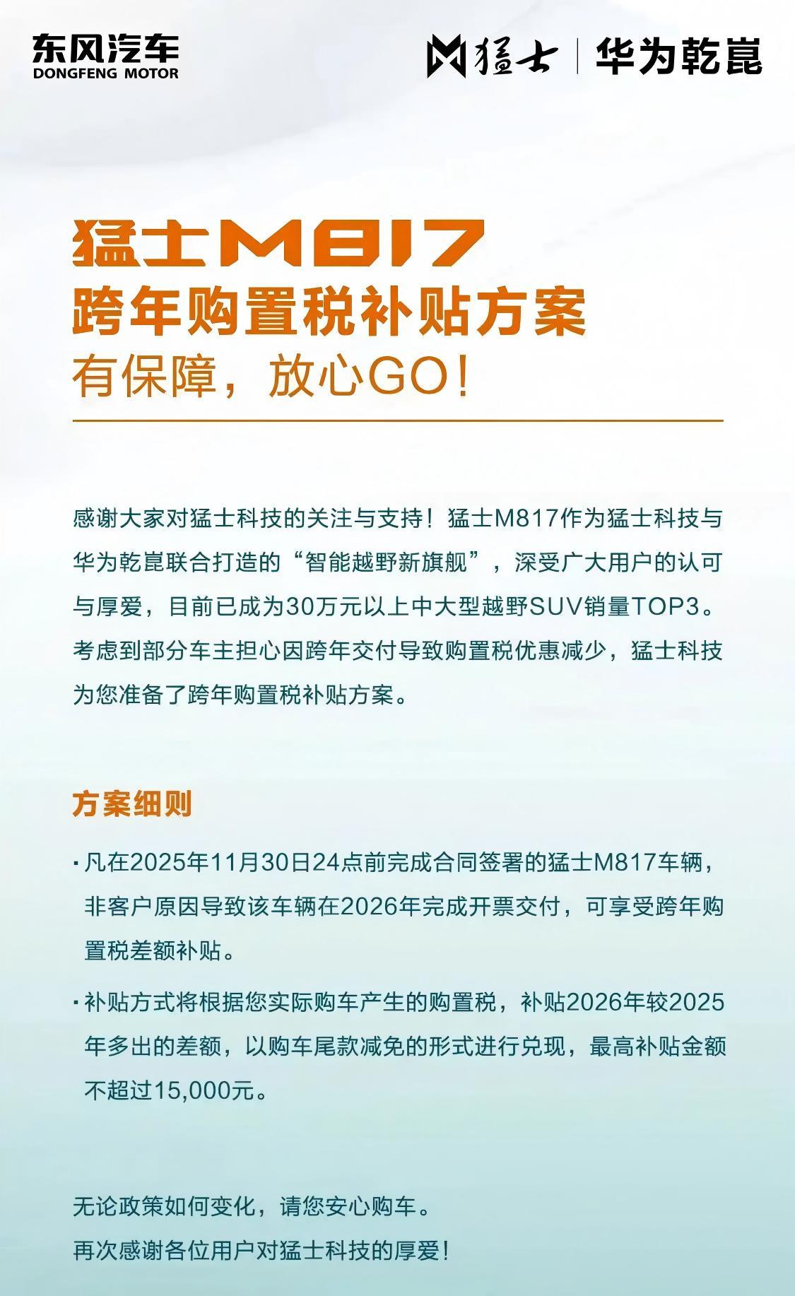 猛士M817的准车主们,跨年购车的购置税焦虑,厂家给你兜底了![666] 简单说下重点: 1. 时间窗:2025年11月30日24点前完成合同签署。 2. 触发条件:非客户原因导致2026年开票交付。 3. 补贴内容:2026年购置税较2025年多出的差额。 4. 兑现方式:购车尾款减免。 5. 上限:最高补贴15000元。 明年的购置税减半政策,今年买车就怕遇到这种“交付即跨年,优惠少一半”的尴尬。现在好了,只要在11月30日前下单,哪怕明年才提车,多出来的购置税差额厂家给补,最高1万5。