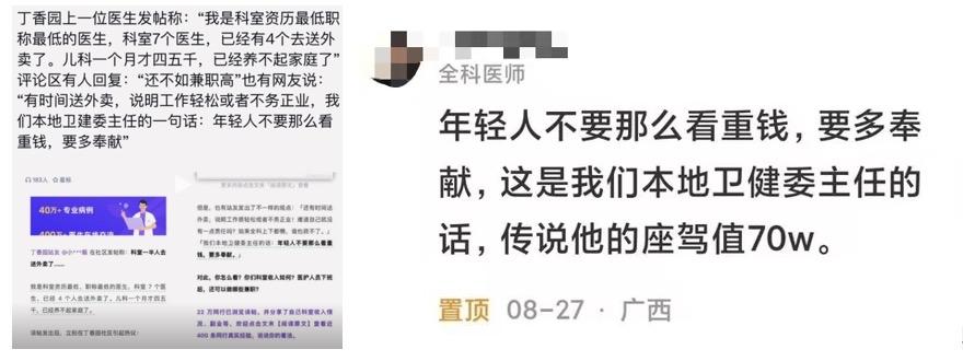 科室7个医生4个下班后跑外卖?月薪仅四五千,不跑咋养家? 最近刷到丁某园的热帖