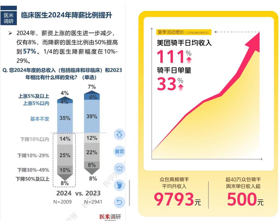 科室7个医生4个下班后跑外卖?月薪仅四五千,不跑咋养家? 最近刷到丁某园的热帖,有个医生说科室7个医生,4个下班会去送外卖,毕竟每月四五千工资,连家都快养不起了。 这句话引起了很多从业者的共鸣,有护士就说了只要有空闲,自己就会去跑外卖,主要就是工资太低,还有医生直言“比较可笑的是,单位绩效只发了1000多,业余跑外卖却挣了两千多。” 其实这样的困境在医疗圈并非个例。医米调研显示,2024年57%的医生遭遇降薪,四分之一人降薪幅度超10%,今年6月美团数据显示,众包高频骑手平均月收入已达9793元。这么算下来,发帖医生的工资还不到外卖员均薪的一半,心里不平衡也难怪。 可当医生们为生计奔波时,当地卫健委主任却抛出“年轻人别太看重钱,要多奉献”的论调,甚至有人说,“不体面不务正业”。这些话听着轻巧,却忽略了成年人的现实:奶粉钱、物业费、房贷、老人医药费,每一笔都得靠真金白银支撑。 而且不止医生,国企员工、机器人研发工程师也爱兼职送外卖。对他们而言,这不仅是补贴家用的方式,也是精神放松的宣泄口。所以现在还拿“医生送外卖不体面”说事的,实在有些落伍,它灵活自由、多劳多得的特点,正是很多年轻人想要的工作环境,甚至不少人因此,直接辞去原本工作,全职跑起了外卖。 说白了,成年人的生活,先得能体面才能谈“奉献”。你想啊,医生们苦读了快二十年,熬了多少夜才捧起这份职业。可要是连房租、生活费都得掰着手指头算,哪还有心思安安心心去给病人看病、救死扶伤呢?
