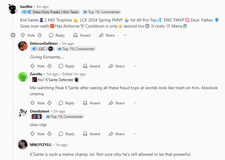 [-]Kiin桑提,两个MSI冠军,2024LCK春季赛FMVP,一阵上单,EWC的FMVP,Zeus的父亲,可以穿墙,有击飞技能,CD只有2秒,仅消耗15点法力值。