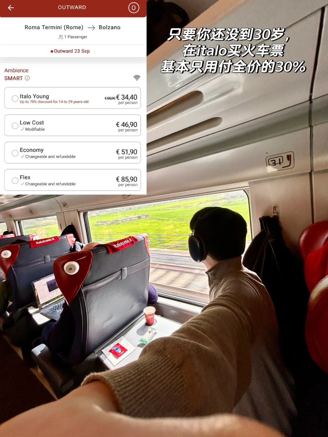 罗马到博尔扎诺的车程,五个小时,我没有提前很早买票,却只花了30多欧,也就是两百多人民币搭上了车。青年票,只要没到30岁就能买。