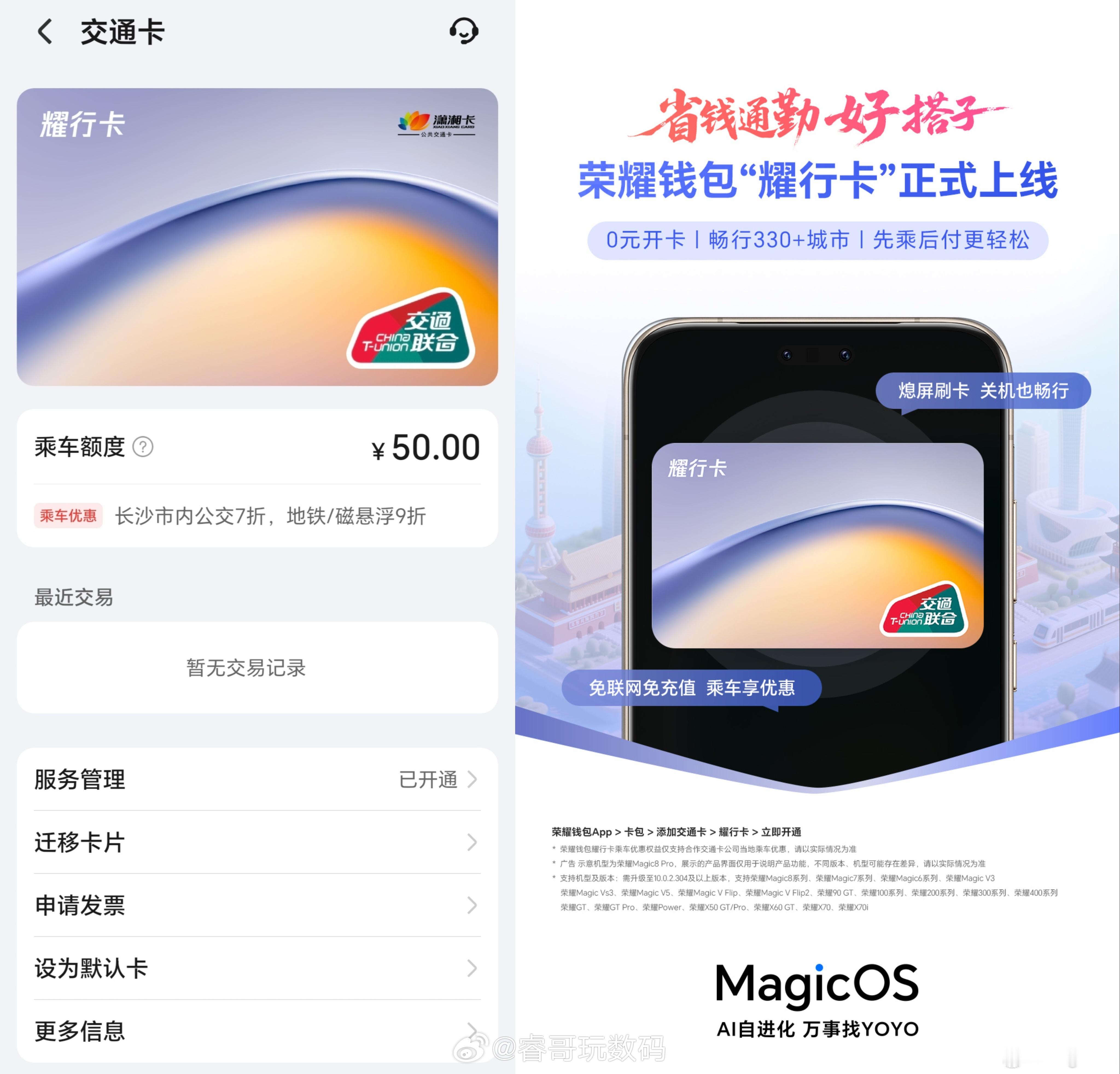 刚开通了最新上线的荣耀钱包交通卡“耀行卡”,安卓首个支持“先乘后付”的数字交通卡,无需开卡费、50元额度无需提前充值、即乘即扣,无需担心换手机忘记迁卡导致损失。全国330多个城市可用,熄屏刷卡无需联网,手机关机也能刷,乘车还享当地交通卡专属优惠,太方便了!
