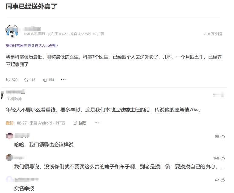 果然,“劝人学医天打雷劈”,这句话含金量还在上升!如果不是这么多医生爆料,不敢相信是真的,跟大家印象中差别太大了。 最近刷到医生论坛的一条帖子,有儿科医生爆料,他们科室7个医生,已经有4个人跑去送外卖了。没办法,一个月四五千的工资,已经不够养家糊口了,跑外卖补贴点家用。本来还不信是真的,但是评论区好多医生都在说,确实让我有点震撼。 说说我的看法吧,第一,其实现在像医生、教师包括国企单位坐办公室的,是非常稳定而且光鲜,但是很多年轻人,收入其实没那么高,不是大家想象的,有了工作就衣食无忧了。 第二点,对骑手这份工作印象有改观,以前只看到了外卖小哥辛苦、累的一面,但是他们收入和付出还算是成正比的,我有朋友在上海跑外卖,一个月收入8000多,在老家小县城的,一个月也能收入四五千。今年美团也公布过相关数据,全国范围内高频骑手月均收入区间为7230元至10100元,其中一线城市高频骑手月均收入达10100元。 当然,不是说骑手这份工作有多好,只是相对我们普通人而言,还算是个不错的选择,像好多35岁失业的,都跑外卖当过渡。比起进厂跑外卖更自由,也更加灵活,而比起当保安或者餐馆服务员,跑外卖收入又要高一些,还更稳定。关于这个问题,大家怎么看?