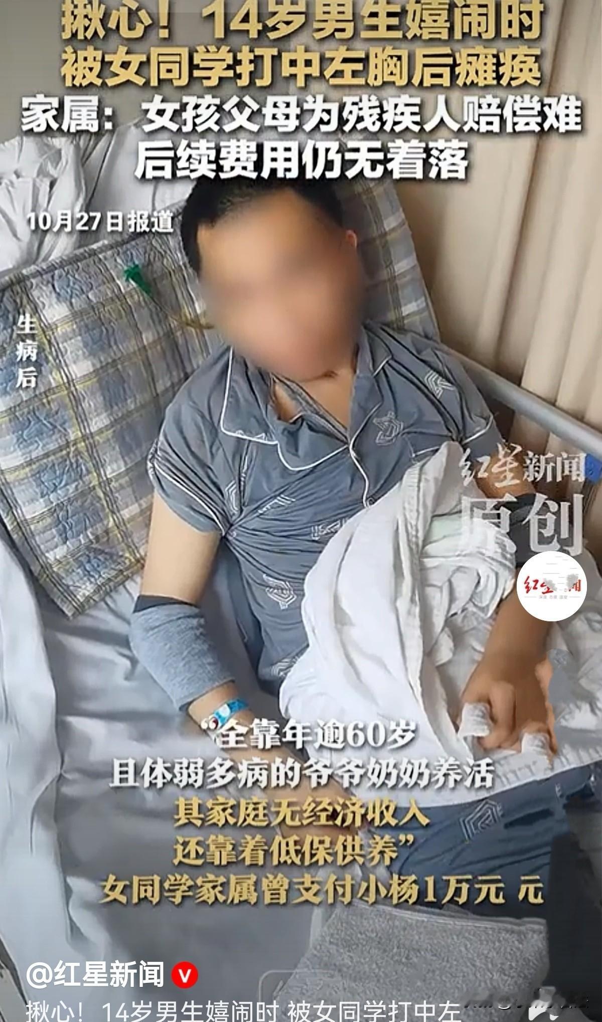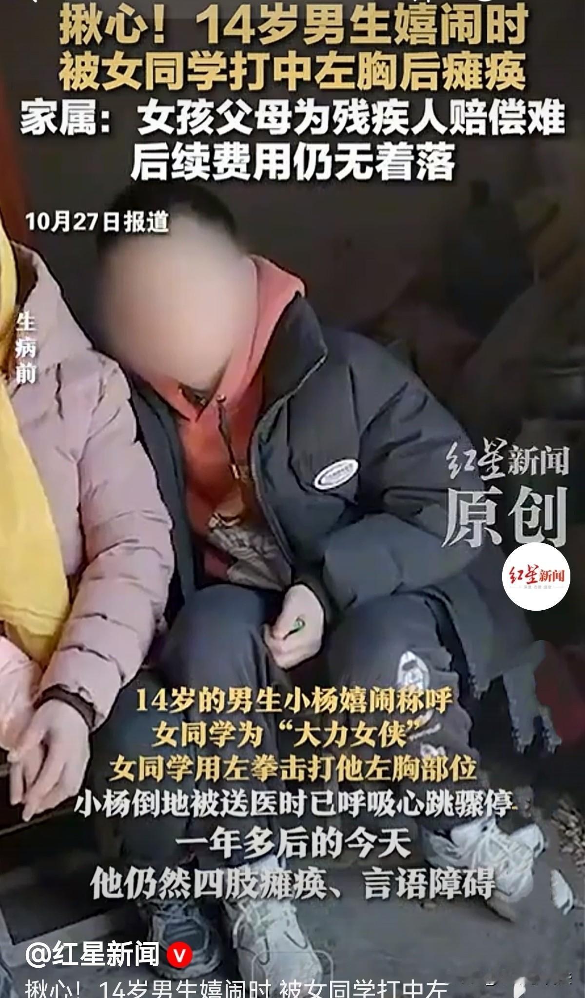 山东郯城,14岁男生在学校楼道嬉闹,开玩笑称呼女同学“大力女侠”,两人一个比划攻击一个做防护动作,女同学突然出拳击打男生左胸口一拳。本来是闹着玩的,谁知男生突然脸朝下倒地昏迷,一物理老师来回两趟都未管,一同学叫来另一老师,才把他送进医院。而在送医途中,男生小便失禁,呼吸心跳骤停,经抢救保住了性命,却四肢瘫痪,意识模糊不会说话。男生家属将学校及女同学告上法庭,追究责任。可虽赢了官司却仍拿不到钱给孩子治病,让人痛心! 2024年5月21日晚自习,14岁的小杨与同班女同学在楼道聊天嬉闹。 他开玩笑说女同学是“大力女侠”,平时他们一起打闹惯了,女同学也没有生气,就朝小杨比划作出要打他的动作,小杨做出防守动作。 女同学用左拳猛向小杨的左胸口捣了一拳,谁知,小杨随即捂着胸口蹲下脸朝下栽倒在地,昏迷不醒。 同学们惊呼并围拢过来,一名物理老师经过,询问了一下,然后接电话就离开了。 之后他又返回看了一眼小杨,进了教室又出来再次离开,根本没管他。 4分钟后,一同学跑去叫来另一老师,老师掐 人中,小杨才有了呼吸。 老师和同学合力将小杨抬进这名老师车中,迅速将其送进医院。 在送医途中,小杨小便失禁并呼吸心跳骤停。 事发约15分钟后,小杨被送入抢救室,经36分钟抢救恢复自主心率,抢救49分钟后恢复自主心跳。 相关诊断显示,小杨出现呼吸心跳骤停、缺氧缺血性脑病等。 截至2025年3月20日,小杨先后在5家医院住院治疗共303天。诊断均为缺氧缺血性脑病。 2025年9月13日出院记录显示,出院诊断包括:四肢瘫痪、累及认知功能和意识的其他和未特指的症状和体征、吞咽困难、言语障碍、缺氧缺血性脑病等。 出院情况包括神志模糊,言语不能,复述不能,表达不能等。 好好的孩子就瘫痪了,小杨父母无法接受这样的事实,一纸诉状将学校及女同学告上法庭,要求他们承担责任。 《民法典》第1200条规定:限制民事行为能力人在学校或者其他教育机构学习、生活期间受到人身损害,学校或者其他教育机构未尽到教育、管理职责的,应当承担侵权责任。 法院审理认为:学校未派相关管理人员对晚自习下课时间,楼道内聚集嬉闹的学生进行维持、管理秩序,并且物理老师发现小杨异常未及时反映情况。 另一老师到来也未拨打120,亦未有校医等专业医护人员护送去医院,学校未尽到管理、保护的义务,对事件采取的处置、救助措施明显不当,应承担相应的侵权责任。 《民法典》第1165条规定:行为人因过错侵害他人民事权益造成损害的,应当承担侵权责任。 女同学虽是与小杨嬉闹,用左拳猛向小杨左胸口捣了一拳,这一行为虽可能并非故意造成严重后果,但客观上其攻击行为与小杨后续倒地昏迷、出现严重病症存在一定因果关系,女同学存在过错。 由于女同学是限制民事行为能力人,所以应由其监护人承担侵权责任,对小杨因受伤产生的合理损失进行赔偿。 女同学家属辩称,小杨是特异体质,有诊断显示其有肥厚性非梗阻性心肌病,本次事件为意外事件,不应承担责任。 法院认为证据无法证实小杨存在自身疾病、特异体质。 最后一审判决:学校承担70%赔偿责任,女同学监护人承担20%,小杨自担10%。 学校已先行垫付44.6万治疗费用,小杨出事故在学校投保校园方责任险保险期内,所有以保险公司赔偿小杨父母50万元。对于校方先行垫付的费用,可另案主张 学校对此判决不服,提起上诉。 二审驳回其诉求请求,维持一审判决。但变更为保险公司向校方支付垫付款约44.6万元,向小杨支付约5.6万元。 小杨父母说,一年的救治,小杨医疗费已达71万,他们虽赢了官司,可治疗费用仍难以周转。 女同学父母离异,母亲是三级残疾精神病人,父亲为多重残疾人,残疾等级为一级。 她靠着体弱多病年过60岁的爷爷奶奶养活,全家没收入来源,靠低保生活。 法院判她承担13万的赔偿,可她只支付了1万元。 保险赔偿金下来后直接给了学校,学校抵扣了曾垫付的44.6万费用,只支付给小杨父母5.6万。 后期治疗,预估费用较高,就新产生的医疗费用,需要家属先行付款、后续索赔,但家人已借遍亲朋好友,再也凑不够钱付款,希望学校能先行垫付部分费用。 因没钱了,小杨从9月回家一直在家保守治疗,作用好的治疗手段一直没做,想到这里小杨父母就心疼和无奈。 2025年7月,小杨父母在平台发起50万筹款,可直到筹款结束,也就凑到1.5万。 小杨父母实在没办法了,找记者帮忙,希望相当能先垫钱付医疗费,先救治孩子。 可记者拨打校方负责人电话不接发短信不回。 校方负责人曾跟小杨父母电话说:可以申请鉴定、就后续费用进行起诉!他们将服从法院判决。 可小杨父母眼下最揪心的是没钱给孩子进行治疗,小杨仍是瘫痪在床,意识模糊,不会说话! 您对这起事件怎么看?欢迎留言评论!