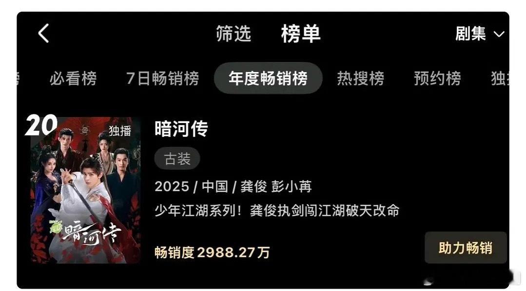 龚俊《暗河传》今天再度破万,广告新增至4个,仅用8天进入优酷年榜。天道酬勤,希望后面能屡破佳绩~