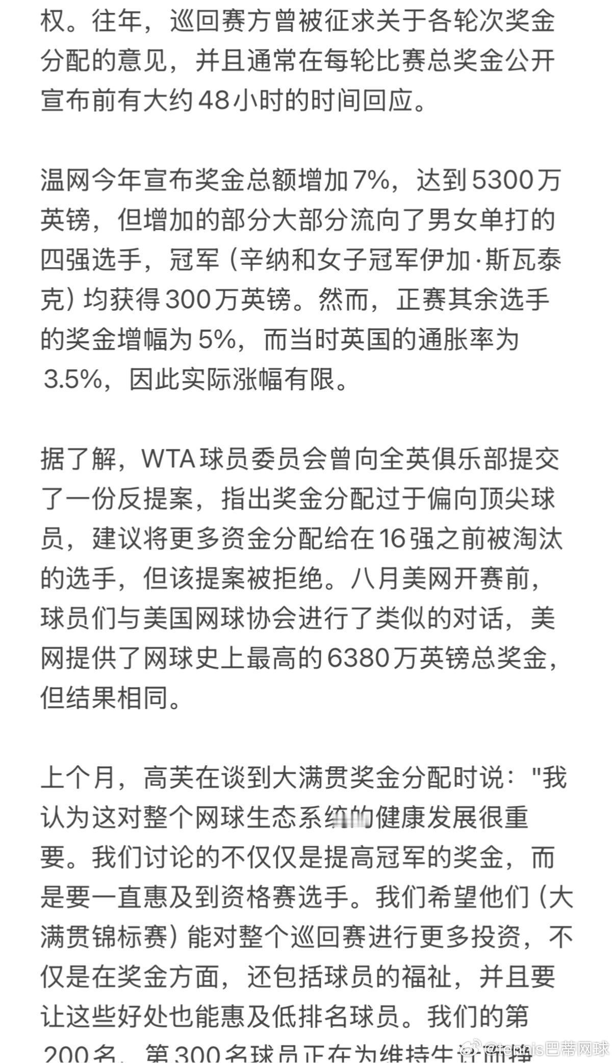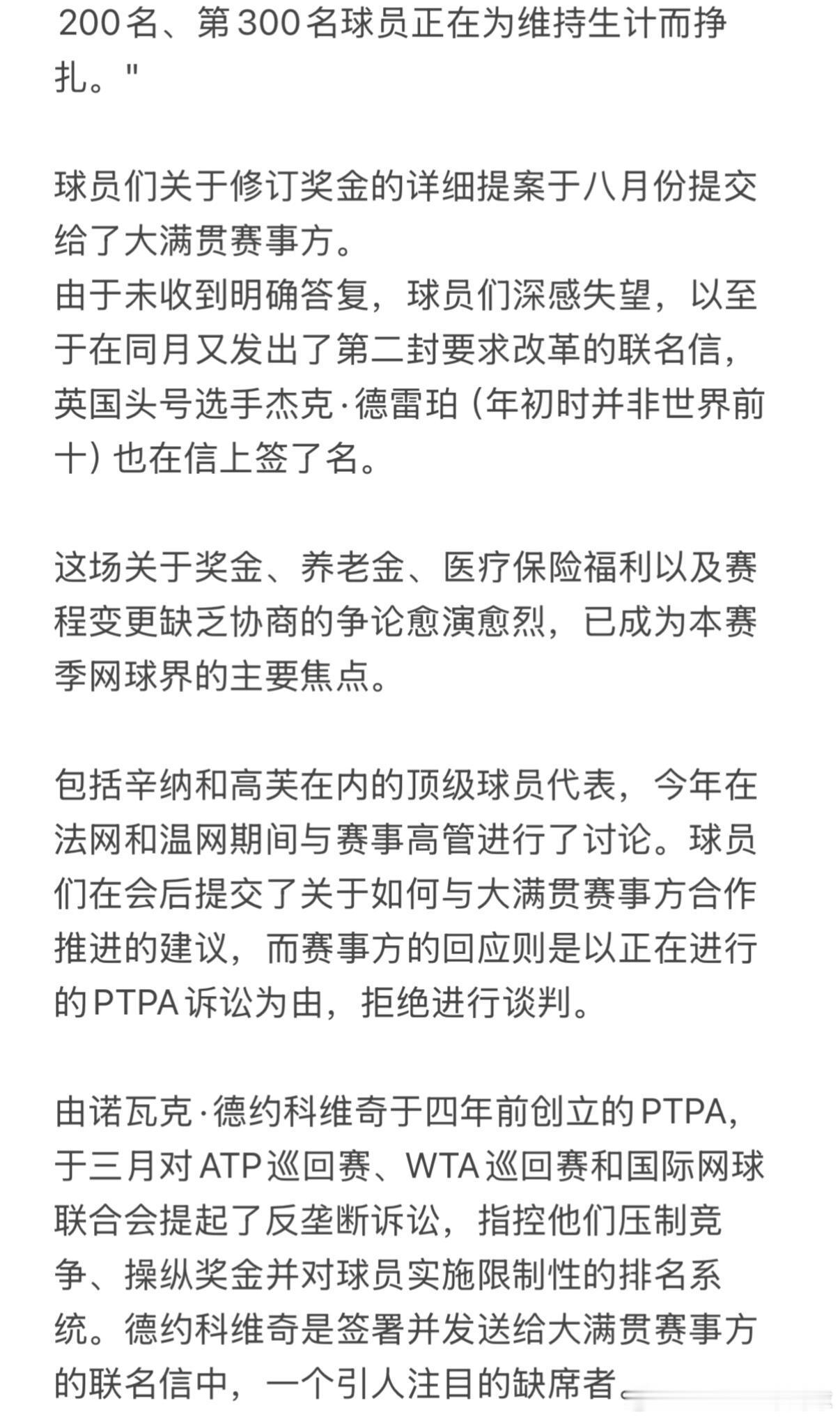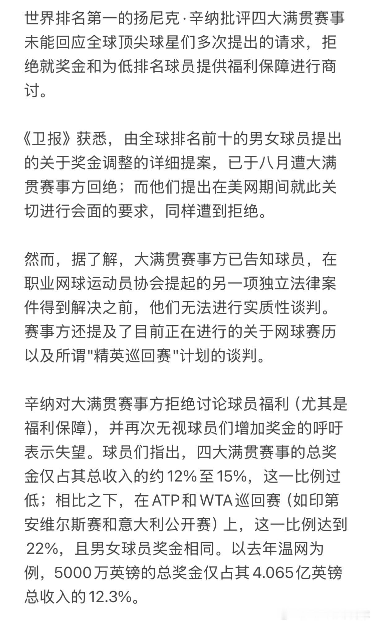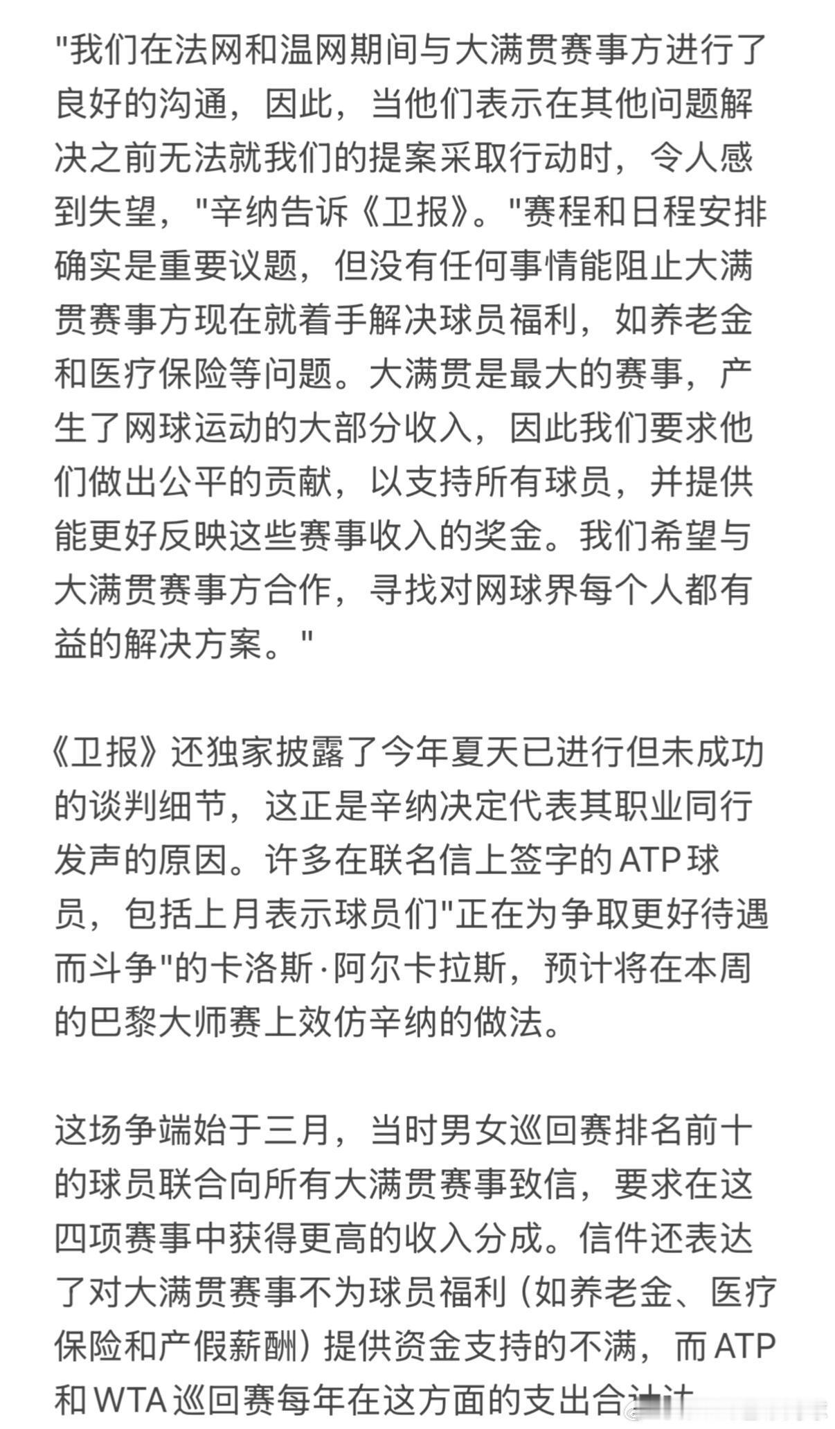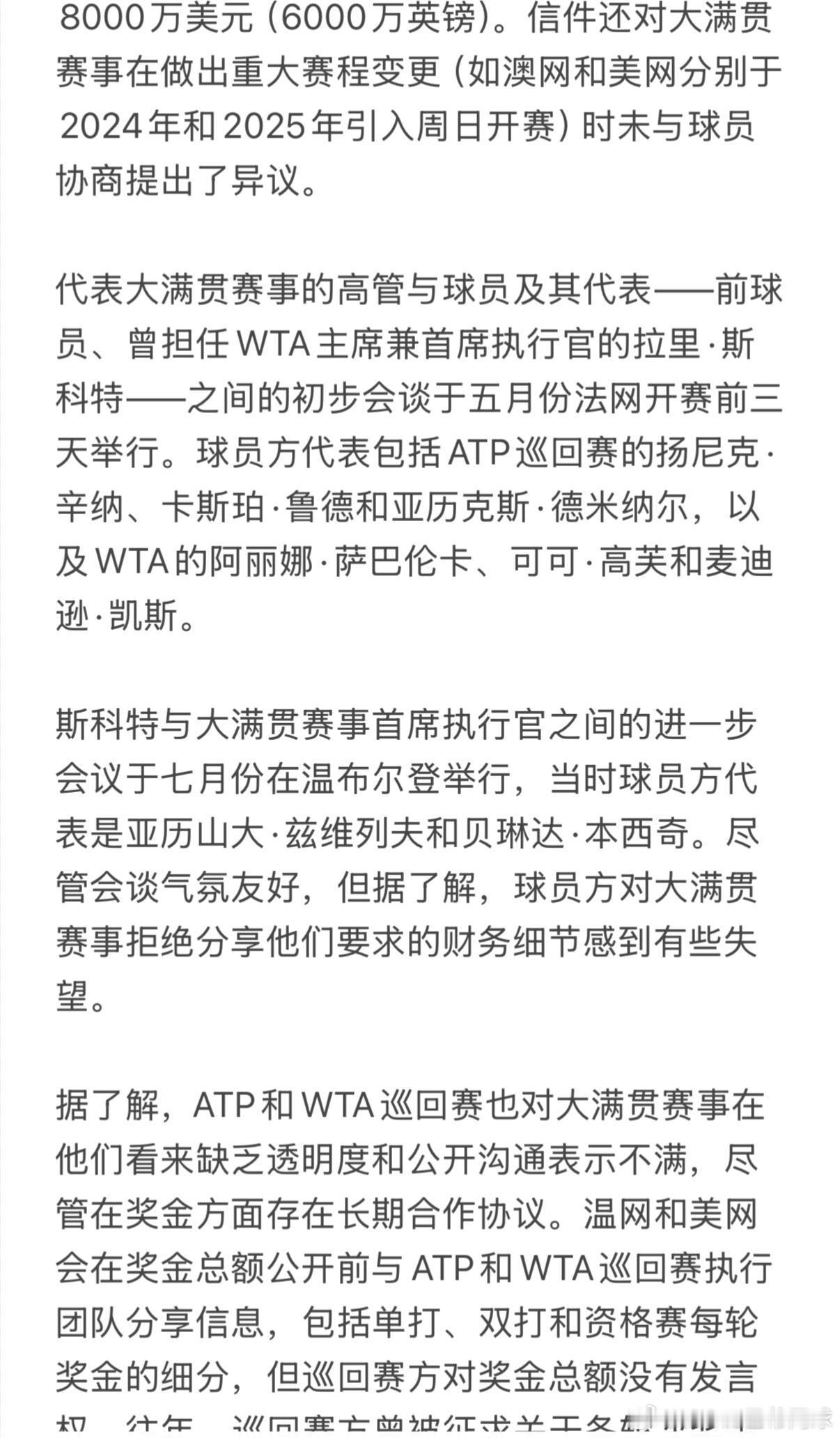 大满贯是最大的赛事,产生了网球运动的大部分收入,因此我们要求他们做出公平的贡献,以支持所有球员,并提供能更好反映这些赛事收入的奖金。我们希望与大满贯赛事方合作,寻找对网球界每个人都有益的解决方案。"