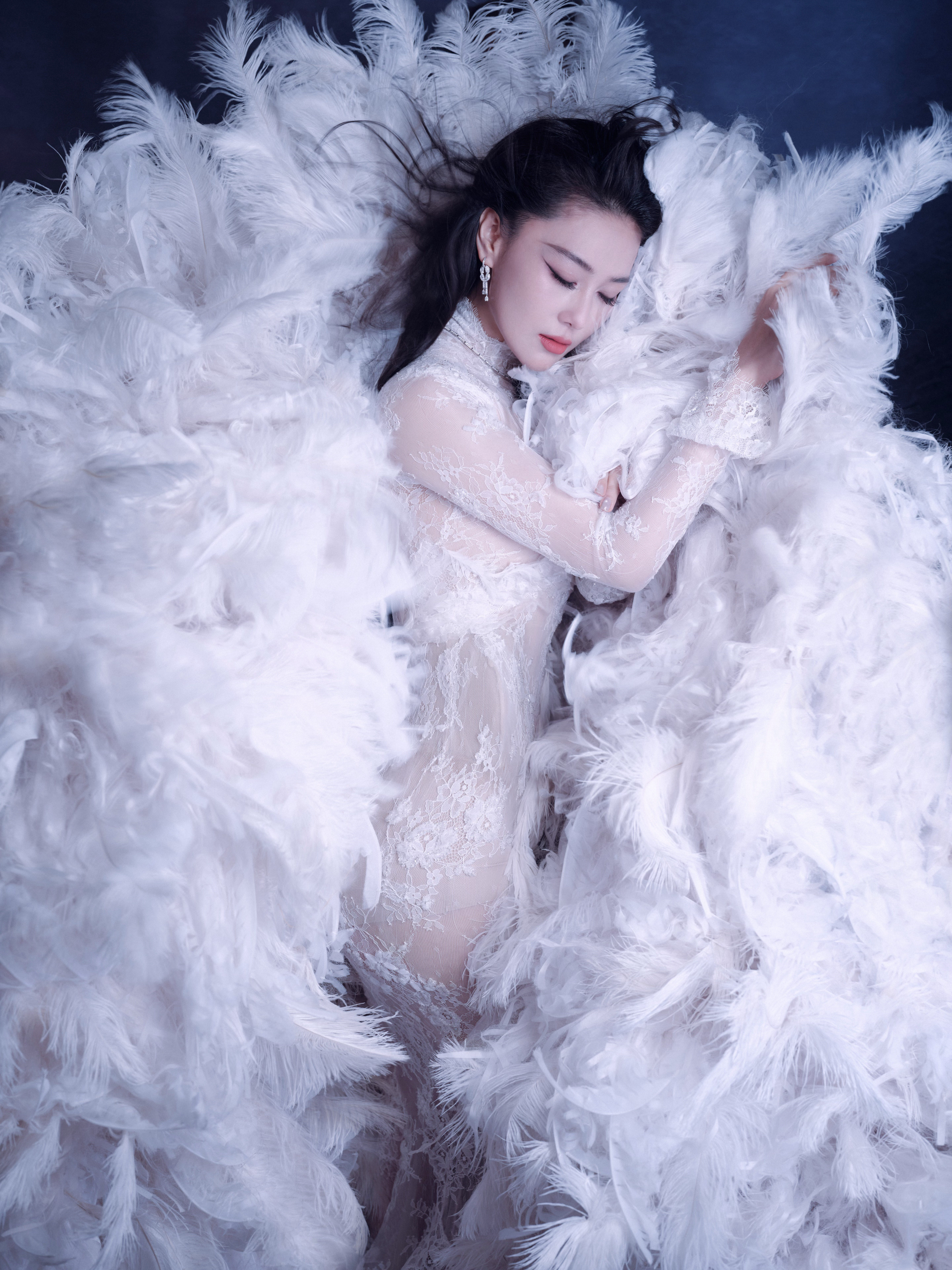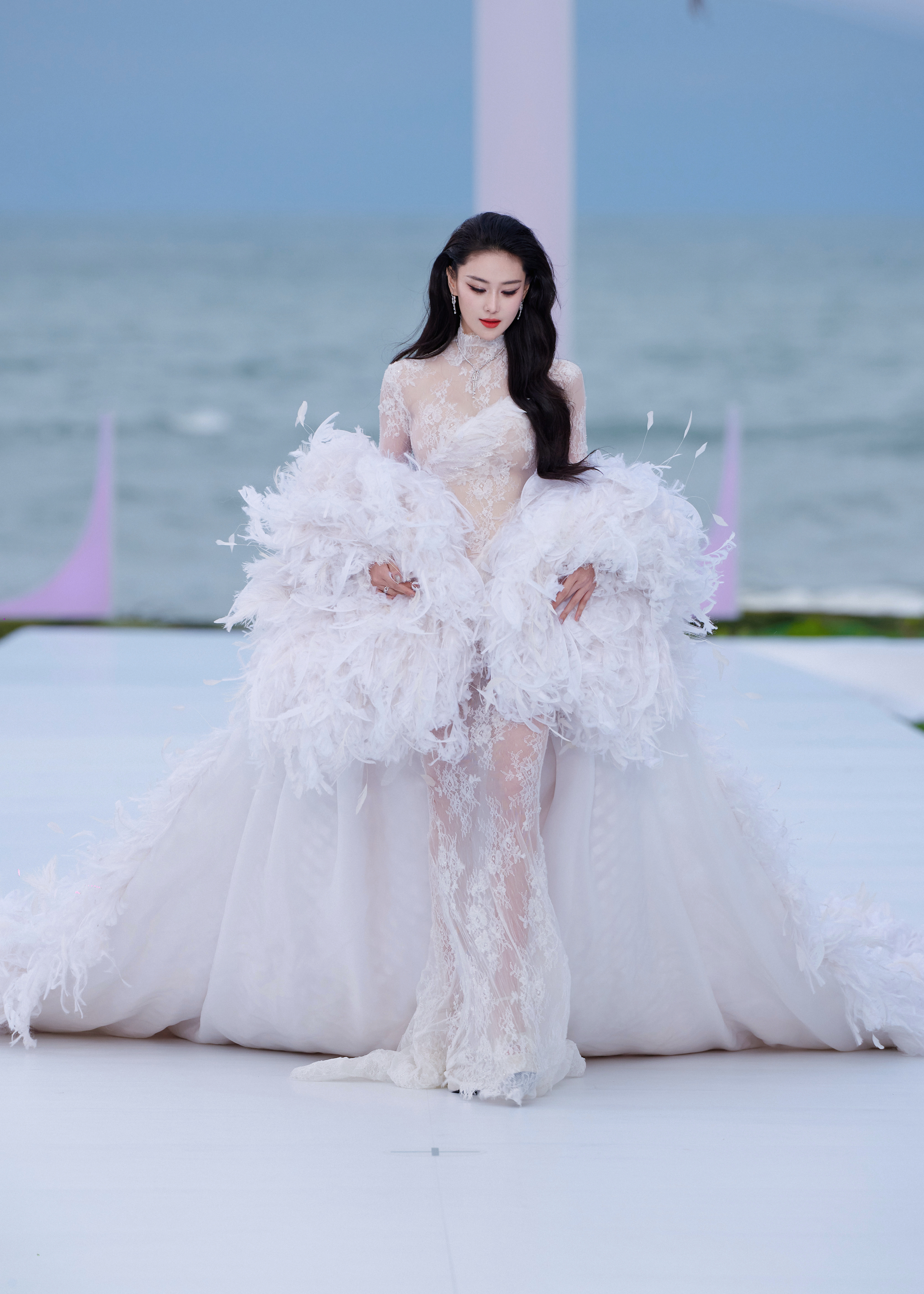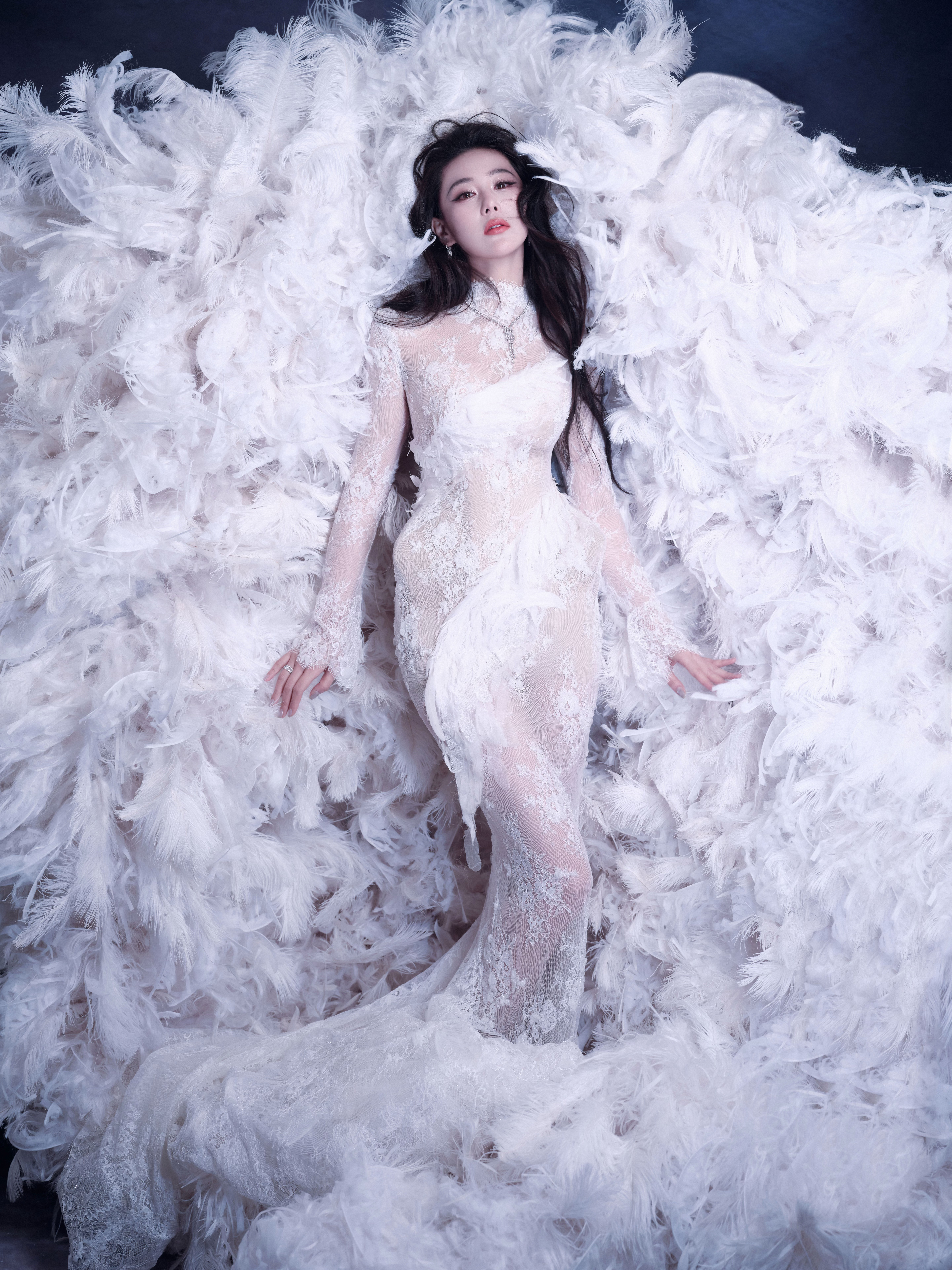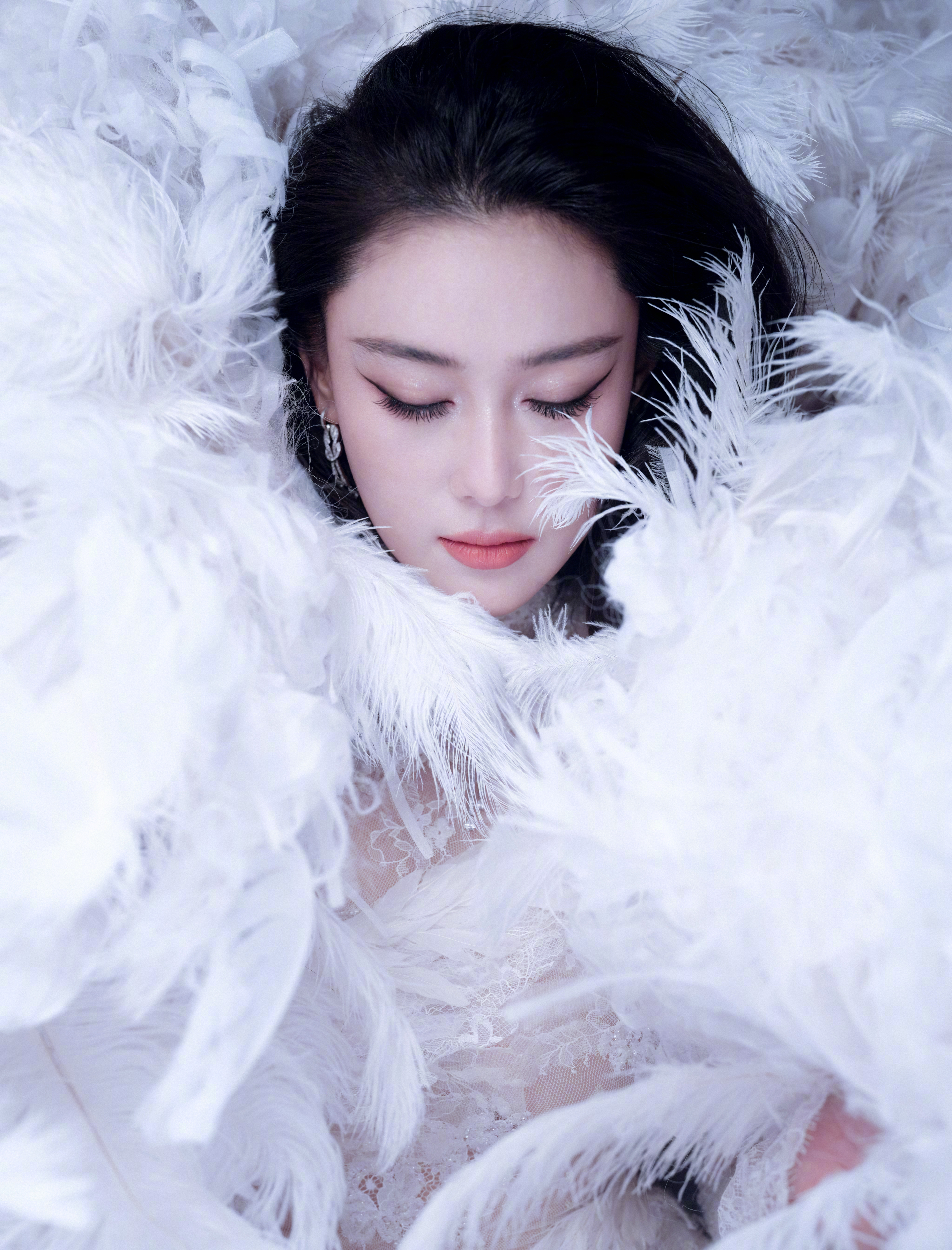 张馨予 于纯白羽浪中翩然伫立,蕾丝曳地如月光织就的梦。张馨予化妆师火了