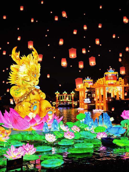 今年秦淮灯会的主会场,水面上的大型麒麟灯组俏皮又可爱