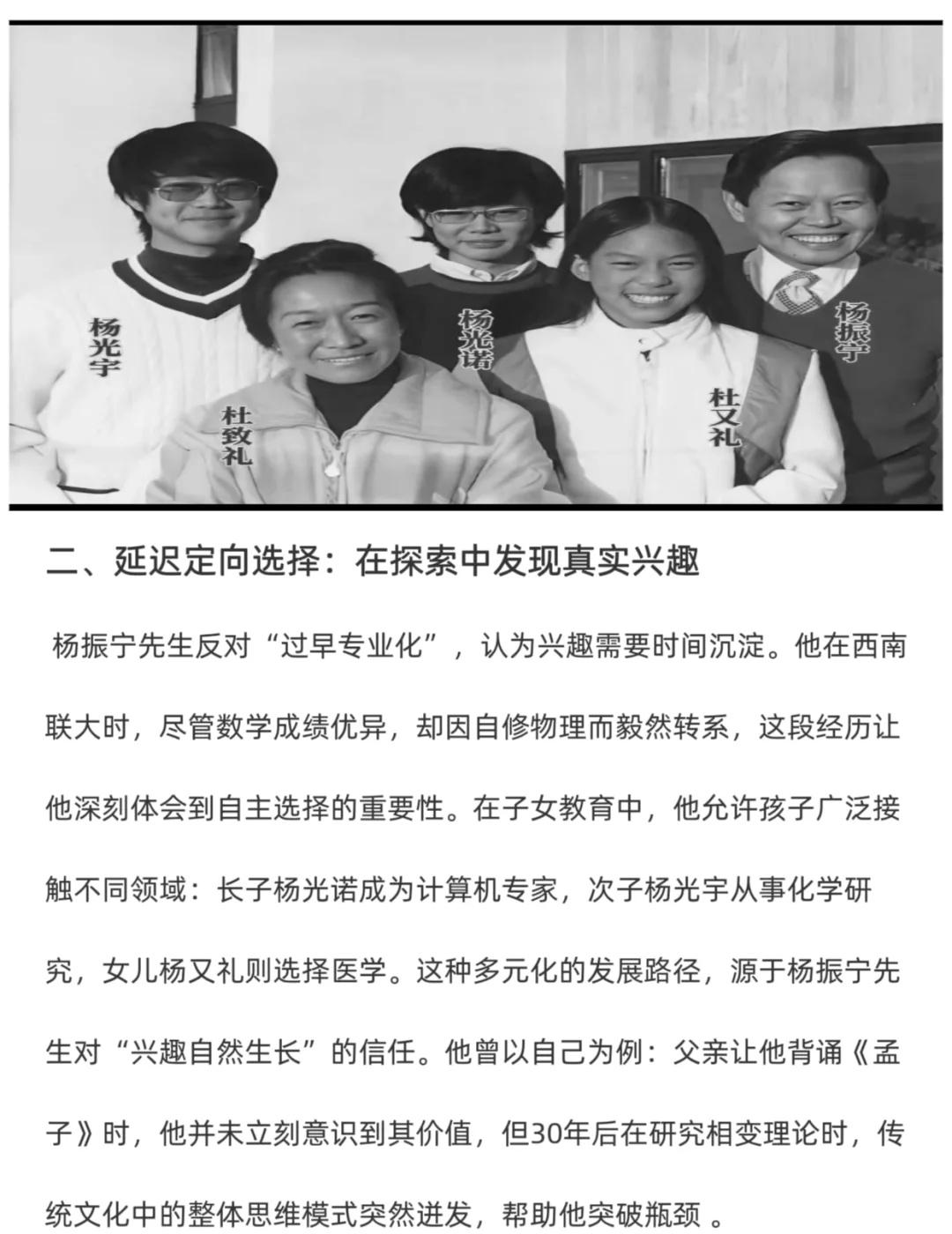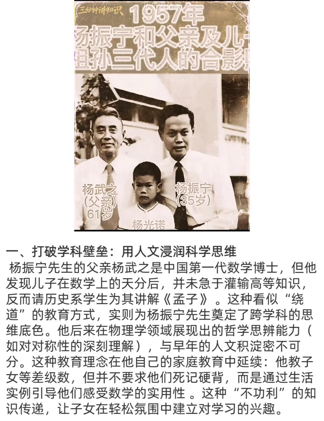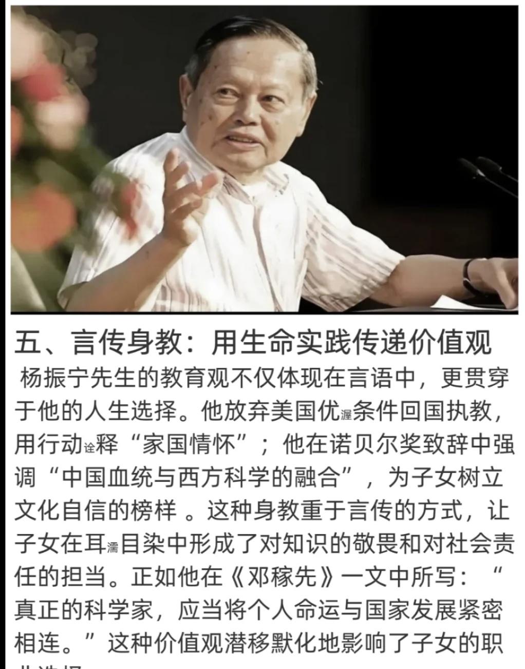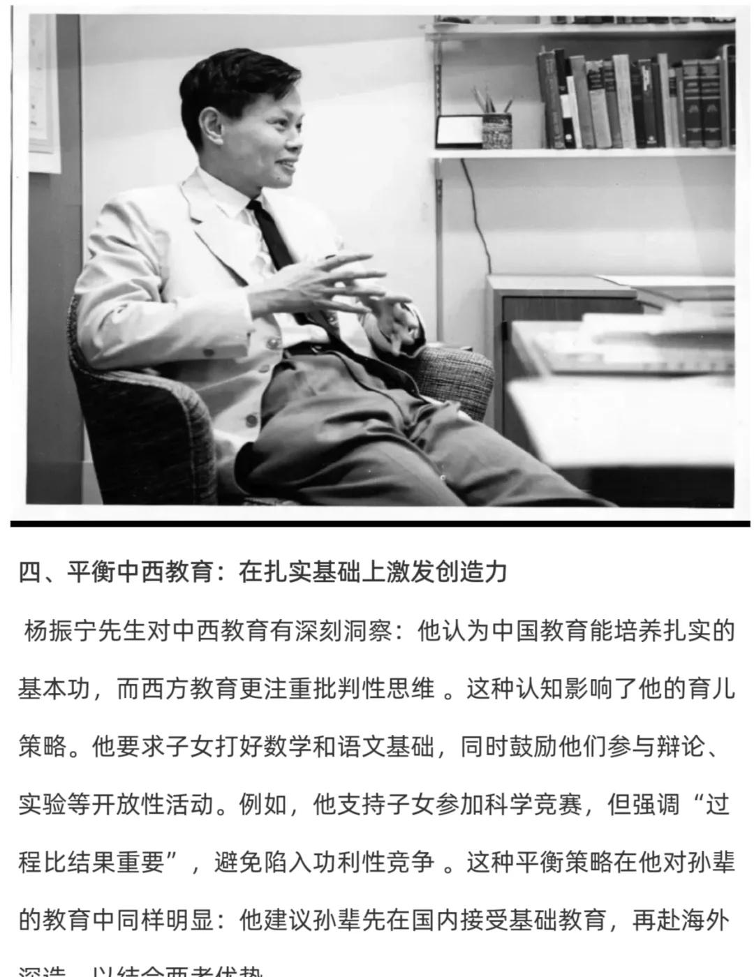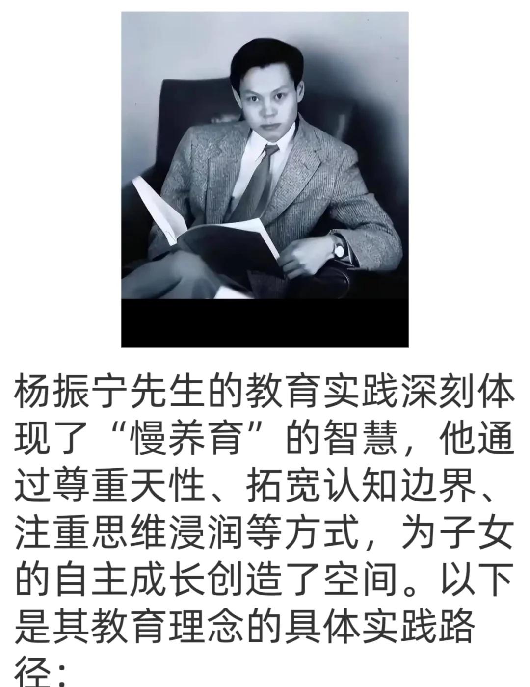 杨振宁的三个子女没在父亲的光环下学物理♻ 👍杨振宁先生的三个子女,没有在父亲的光环下去学习物理,却都特别优秀! ⭐️杨振宁先生教育观它确实触及了当代教育中一些被忽视但至关重要的核心价值。杨振宁先生作为一位科学巨匠,其教育理念却如此“去功利化”,这本身就是一个极富启发性的反差。 ⭐️杨振宁先生的教育实践证明,真正的成长无需揠苗助长。通过打破学科壁垒、延迟定向选择、渗透式学习、平衡中西教育和言传身教,他为子女构建了一个自由探索的精神空间。这种“慢养育”不仅培养了三个领域各异的优秀人才,杨振宁先生这种充满人文关怀的教育理念的源泉。它告诉我们,最好的教育,无论是对于一代物理学大师还是对于普通人,其本质都是相通的:无条件的爱、充分的尊重和耐心的引导。育儿知识 人物故事 育儿教育 科学家精神 教育理念的重要性 科学的力量 对孩子好一点 育儿经验 最重天性