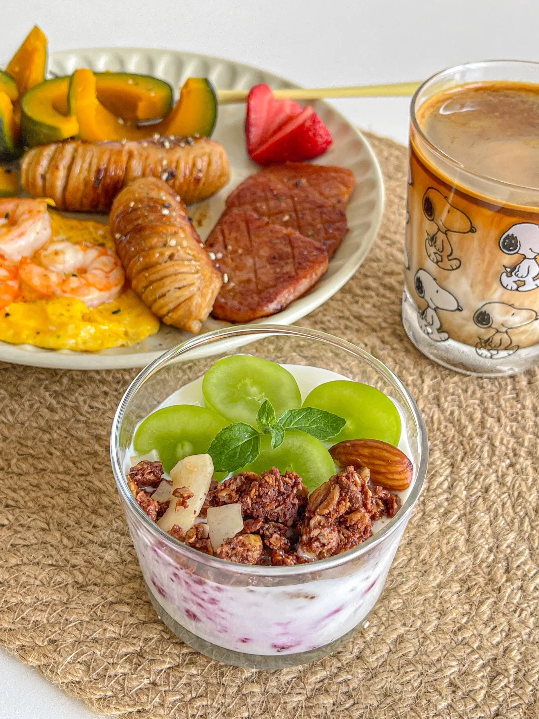 早起蒸了一个贝贝南瓜 粉粉的巨好吃 主食有了再搭配一些咸口的~还有酸奶杯 食材:🥗 贝贝南瓜➕滑蛋➕虾仁➕烤肠➕午餐肉➕草莓 酸奶➕青提➕蓝莓酱➕烘焙燕麦片 简简单单的食材!做法简单快手 而且咸甜搭配 吃起来有滋有味~[色色R][派对R] 今天的dirty油脂还不错 巨香巨好喝!
