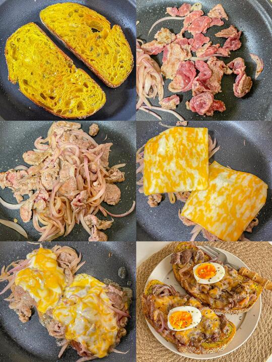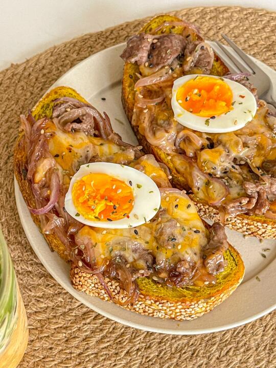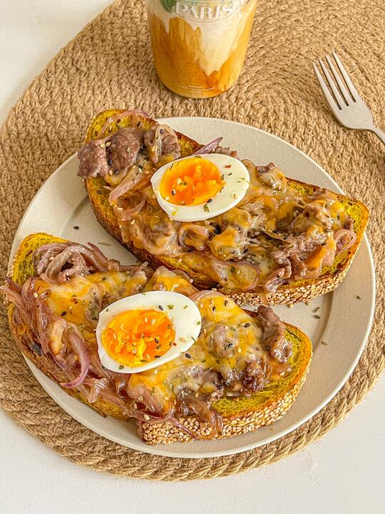 懒人早餐拼盘🍳洋葱牛肉芝士三明治🥪拿铁🥛