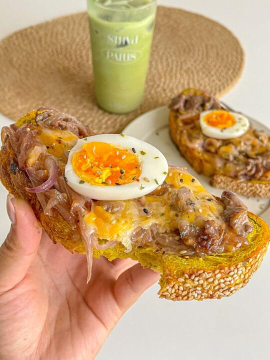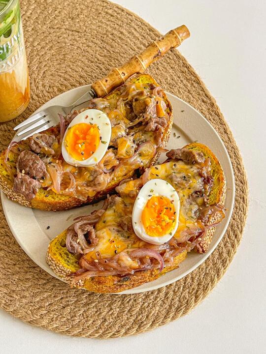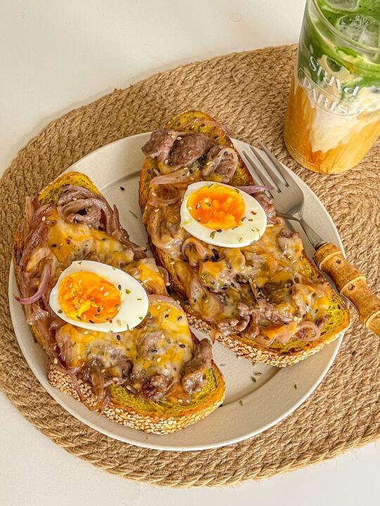简单的懒人早午餐!🍽️ 牛肉三明治 百吃不腻的搭配~ 食材:🥩 欧包➕牛肉➕洋葱➕芝士片➕溏心蛋 饮品:🍃 意式咖啡液➕牛乳➕抹茶 巨好吃的搭配!这个芝士片奶香四溢 搭配牛肉刚刚好👌🏻