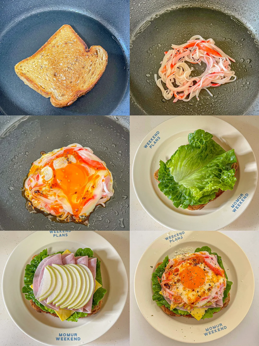 依然是10分钟搞定美味三明治🥪 食材:🍳 吐司➕生菜➕火腿片➕芝士片➕苹果➕蟹柳煎鸡蛋 把冰箱里面想吃的食物都堆在吐司上就可以![偷笑R][偷笑R]