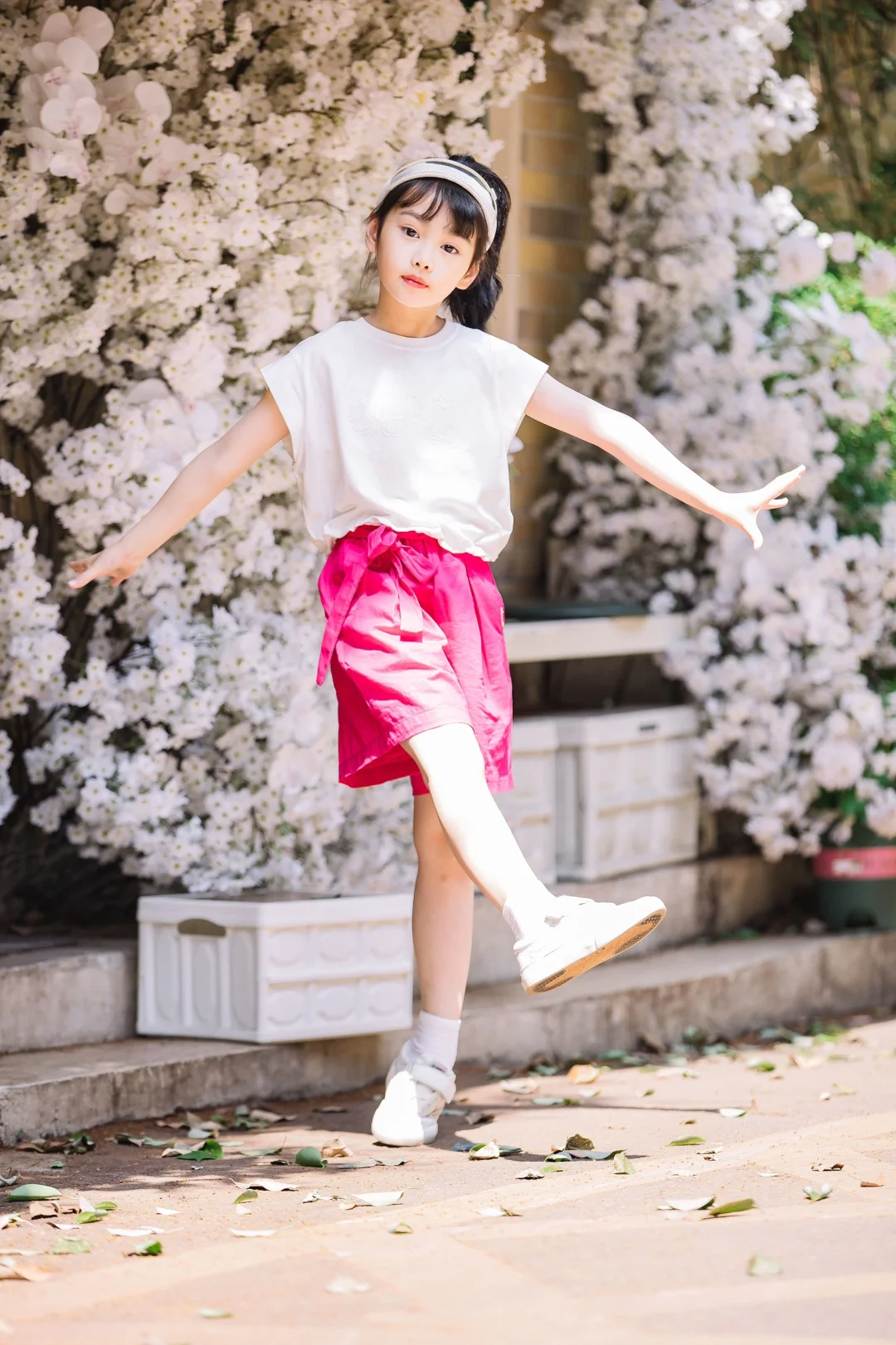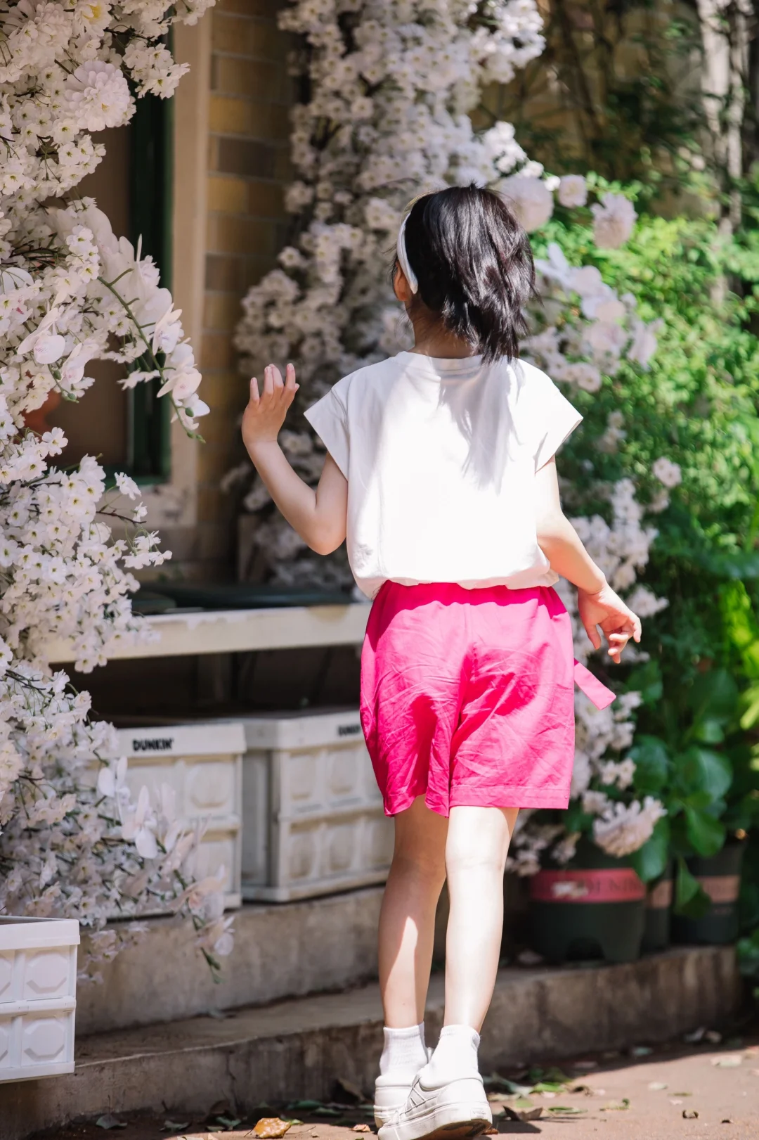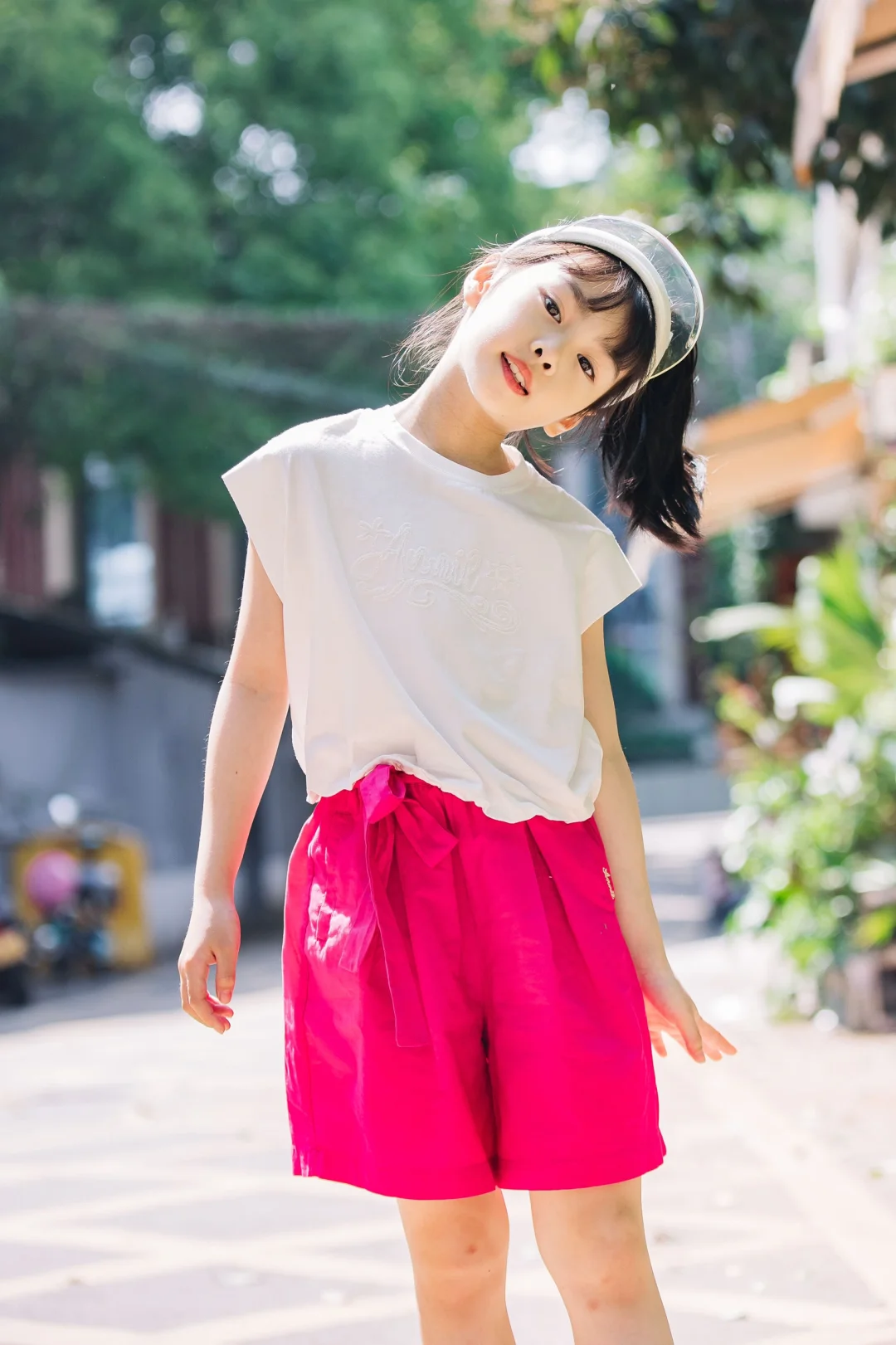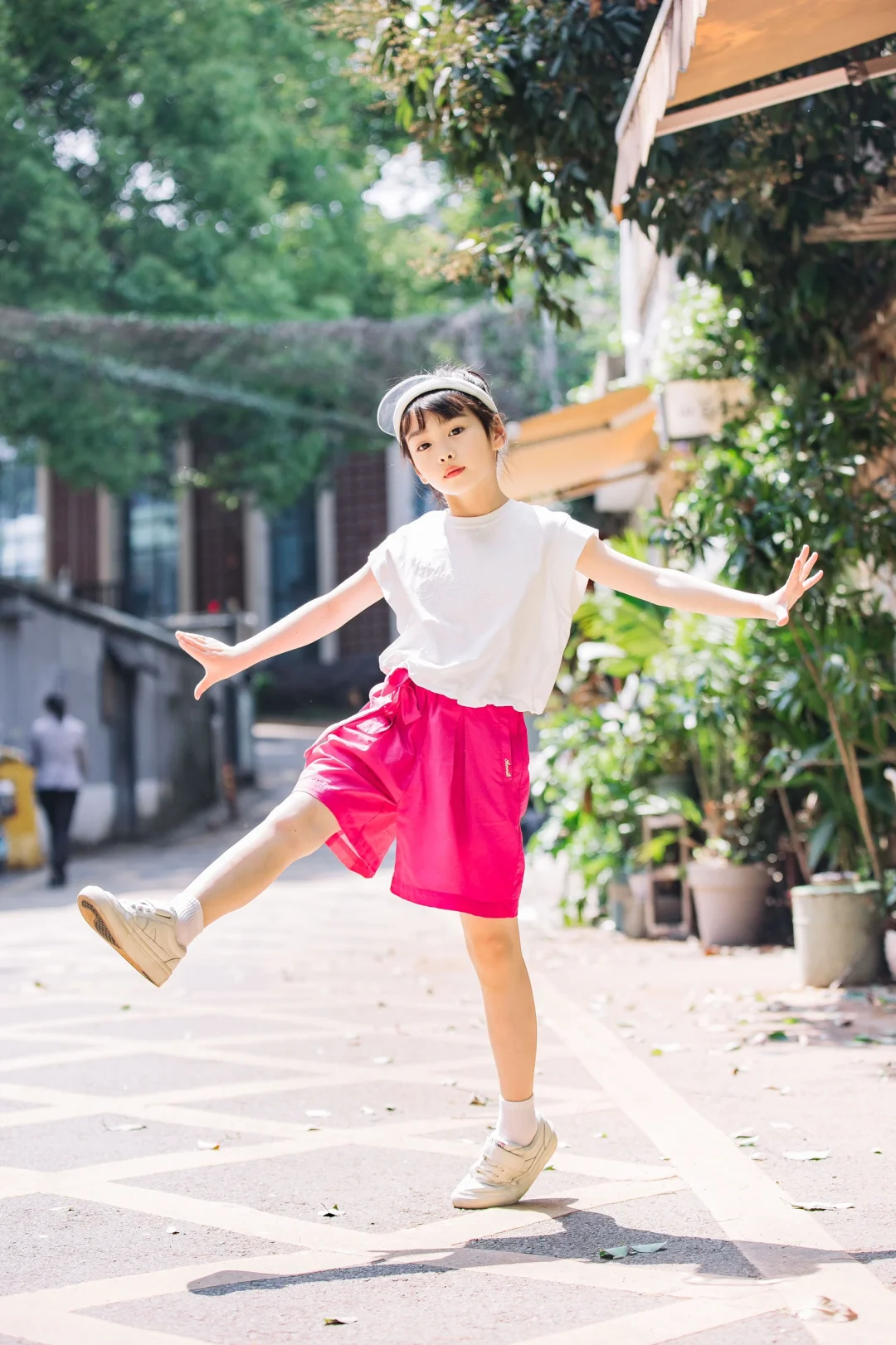 简单白T➕玫红色短裤,在阳光下闪闪发光,甩动高马尾,灵动的发梢,元气满满溢出多巴胺活力