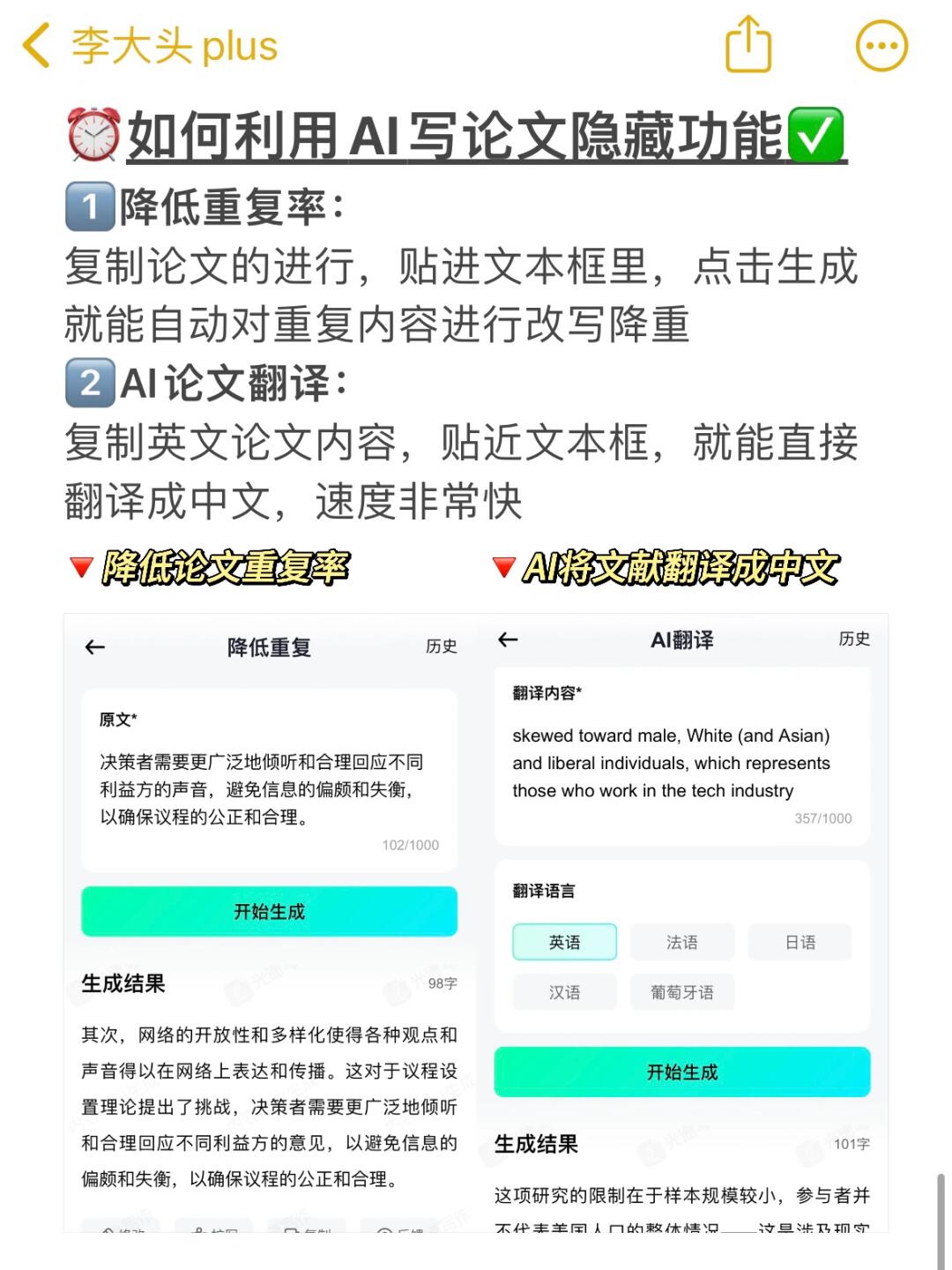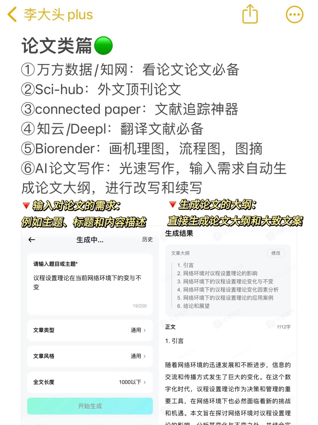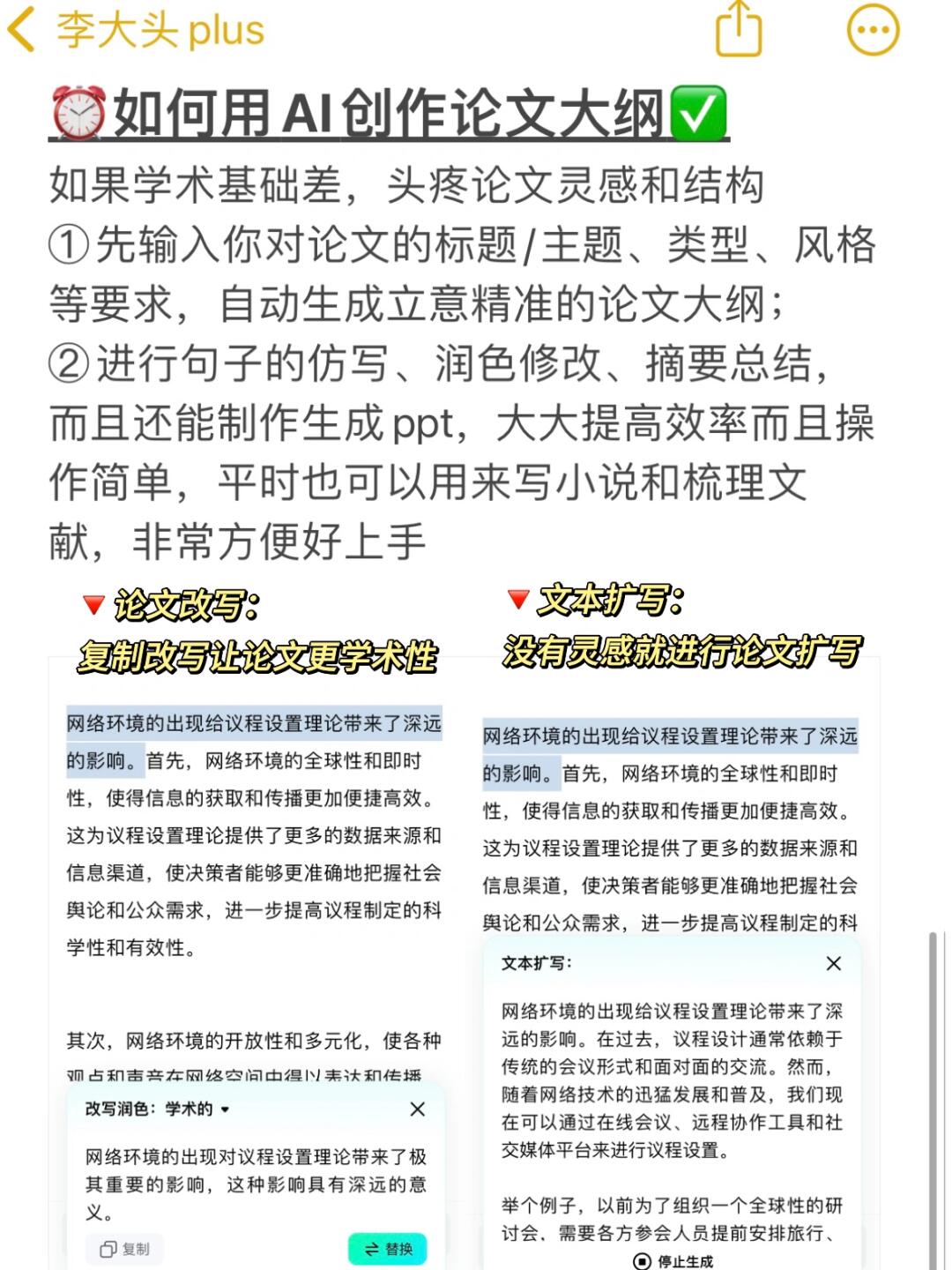 ④AI论文写作:学术基础差,头疼论文灵感和结构的同学,直接在AI里先输入对标题/主题、类型、风格等要求,就自动生成立意精准的大纲,并进行句子仿写、润色修改、摘要总结。还能制作生成ppt,提高效率操作简单,平时用来写小说和梳理文献,方便好上手