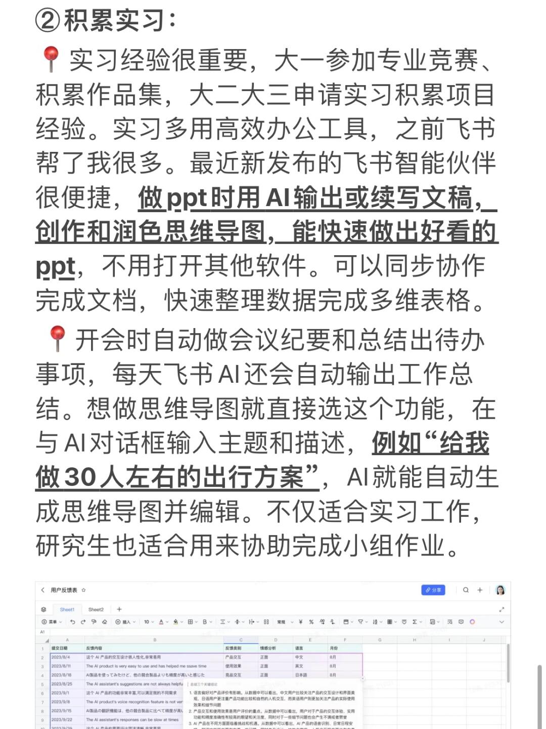 最近看到一句话:“在二本大学有这样一群人,颜值一般、家境普通、绩点平平”没啥技能特长,连集体活动时也只能做边缘人……四年下来毫无改变”。 . 认真想想,我大学4年其实也是这样。但是普通并没有什么好自卑的,我也从二本考去北外读研,也拿到了优秀毕业生。我靠着脚踏实地的努力,慢慢变得越来越好,感觉这才是大学最好的状态。 . ❶坦然接受自己的普通,永远有人比你更优秀 我考研的时候,有学姐说“你即使读名校研究生也改变不了二本出身”,但是等我真正去名校读研后才发现:不管你走到多好的平台,都会有比你更优秀的人,我们要做的就是不断优于过去的自己。 . ❷打破绩点决定论,大学不只有一条路通向成功 大一时我成绩排名专业89名,大二算奖学金却综测前3名。那时我意识到:不是每个人都适合考试,在其他地方努力一样能实现自我价值,比如: . ① 我朋友成绩不好没考研,但也用3年实习经历入职大厂;②虽然我成绩不好,但我还是依靠比赛加分保研北外;③有朋友本科绩点低,却擅长比赛和论文,研究生拿到专业第1名 . ❸摆脱学生思维,抄是成功最简单方法 我学姐四六级600+、专业第1,2天复习1本专业课考到90+,她告诉我这个方法 ①梳理结构:先通读全本书+画出框架,将每章节内容总结成关键词概括 ②默写框架:盖住思维导图,画框架图+背诵要点 ③订正背诵:对照书本,没默出来的内容反复背诵 . ❹不要浪费时间犹豫,掌握自学能力 ①自学英语 ✔️发音:田朝霞语音课+赖世雄音标 ✔️听力:烤鸭tv+bigshot+瑞秋英语 ✔️口语:杨帅口语+夏冰雹频道+yi支糯可恩, ✔️语法:张满胜《英语语法思维》+英语平行世界 . ②积累实习经验 实习经验很重要,大一参加专业竞赛、积累作品集,大二大三申请实习积累项目经验。实习多用高效办公工具,之前飞书帮我很多。最近新发布飞书智能伙伴很便捷,做ppt时用AI输出或续写文稿,创作和润色思维导图,能快速做出好看的ppt,不用打开其他软件,还能同步协作文档,快速整理数据做多维表格 . ③积累论文经验 ✔️万方数据/维普:看中文论文 ✔️翻译:DeepL中翻英,知云英翻中 ✔️Biorebder:科研绘图、画流程图 ✔️镝数据:看行业研究报告