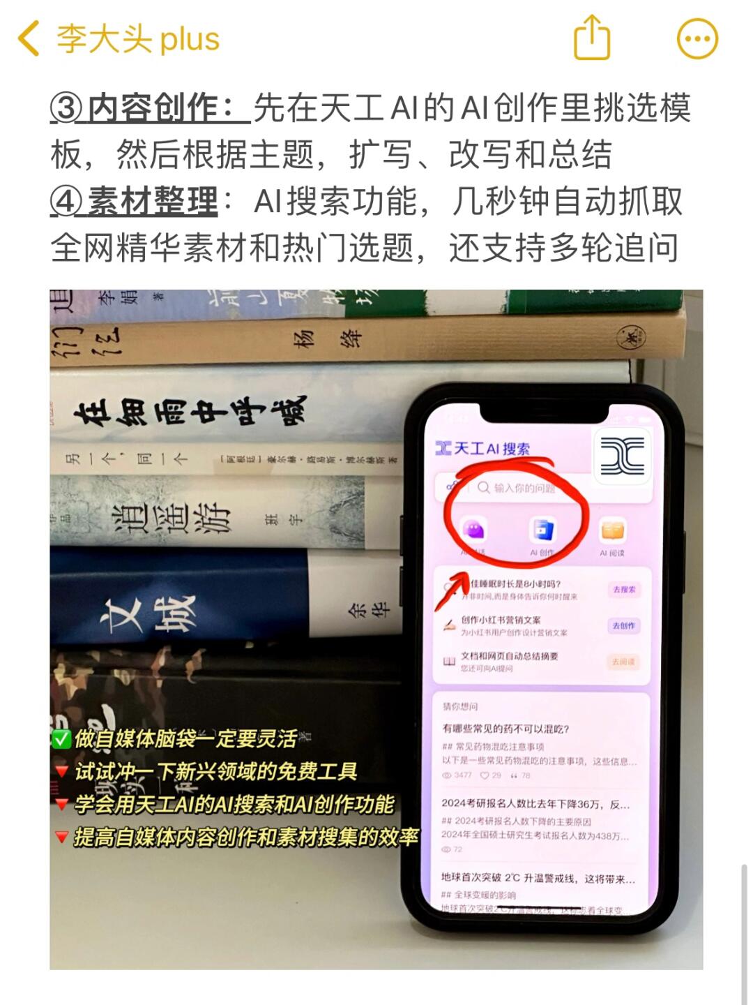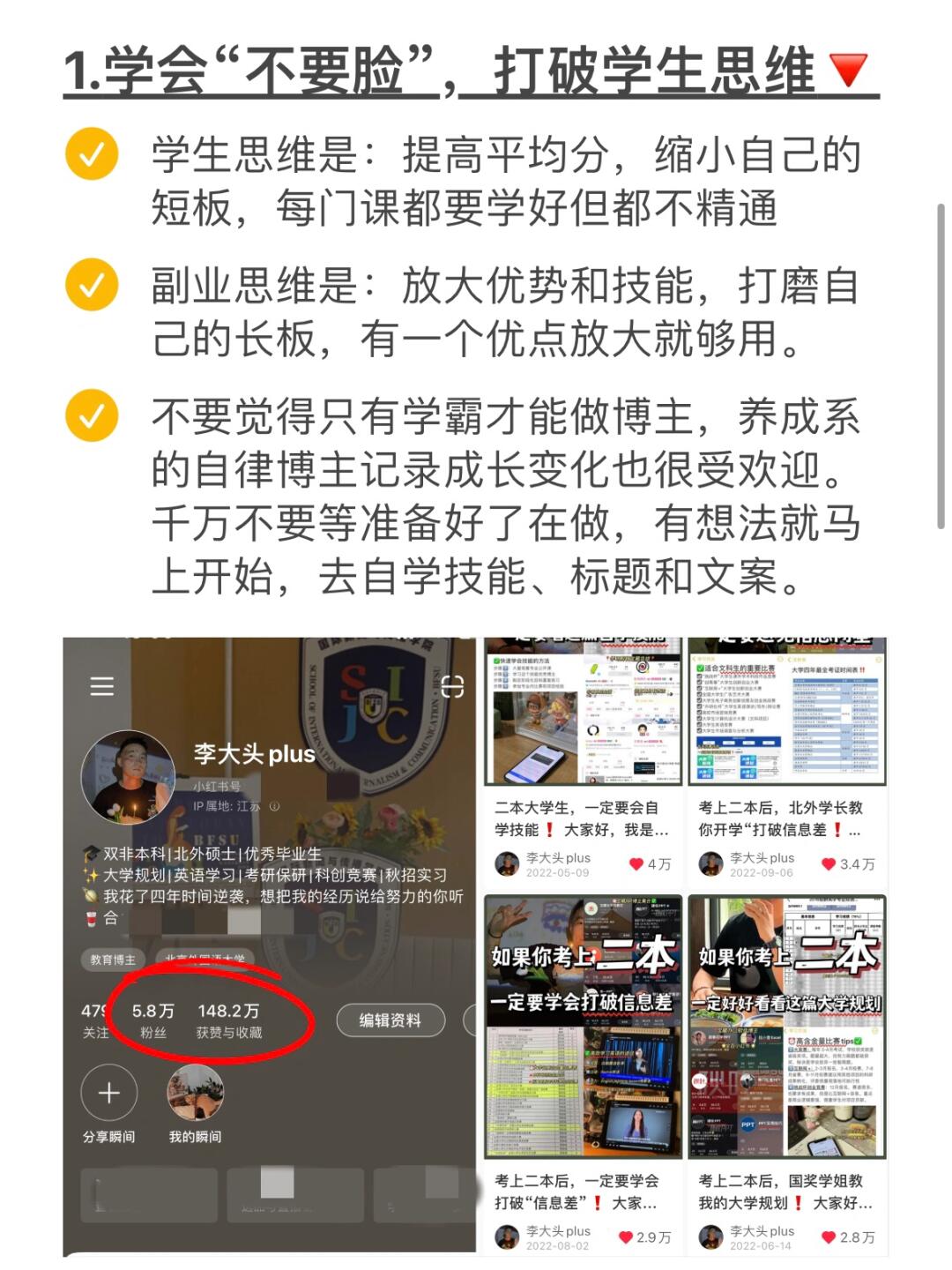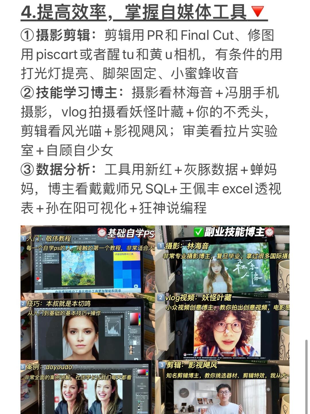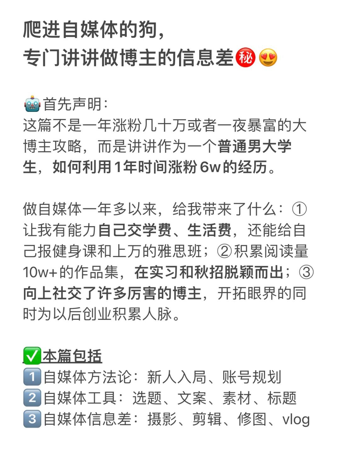 🔻首先声明: 这篇不是一年涨粉几十万,或者一夜暴富的大博主攻略,而是讲讲作为一个普通男大学生,如何利用1年时间涨粉6w的经历。 . 🔻自媒体给我带来了什么: ①让我有能力自己交学费、生活费,还能给自己报健身课和上万的雅思班; ②积累阅读量10w+的作品集,在实习和秋招脱颖而出; ③向上社交了许多厉害的博主,开拓眼界的同时为以后创业积累人脉。 . ❶学会“不要脸”,打破学生思维 学生思维是提高平均分,缩小自己的短板;而副业思维是放大优势和技能,打磨自己的长板。不要觉得只有学霸才能做博主,养成系的自律博主记录成长变化也很受欢迎。千万不要等准备好了在做,有想法就马上开始,去自学技能、标题和文案。 . ❷培养自媒体思维 1️⃣先学“抄”再创新:自媒体起号最快方法就是“抄”,但不是指抄袭,而是:①对标同类型大博主: 选择10-20个博主,列一张表格分析他们的人设、定位、主页风格和内容规划;②对标小博主爆款文章:选择20篇爆文,模仿标题、封面、开头结尾和做图,容易做出爆款; . 2️⃣不要立“完美人设”:自媒体博主越来越多,缺的是独特观点和鲜活个性。从用户角度看,千篇一律的干货越来越多,真实表达情绪、做深度内容越来越少。所以展示自己的不完美和个性,用你的观点去看待和表达,反而越来越受欢迎 . ❸自媒体信息差 ①方法论:池骋知道吗、无畏、栗嘻嘻、池木总监、黄有璨 ②自学书籍:《跃迁》《运营之光》《放大》《从零开始做内容 ③内容创作:不用担心没灵感,先在天工AI的AI创作里挑选模板,直接生成内容很方便;然后根据主题,针对进行段落和内容的扩写、改写、缩写和总结 ④素材整理:内容素材对自媒体很重要,如果害怕找素材效率低,直接用天工的AI搜索功能,几秒钟自动抓取全网精华素材和热门选题,快速提炼出符合选题的信息,还附带信源,能进行多轮追问,强大的素材库让你随时有内容输出 . 4.自媒体工具 ①摄影剪辑:剪辑用PR和Final Cut、修图用piscart或者醒tu和黄u相机,有条件的用打光灯提亮 . ②技能学习博主 摄影看林海音+冯朋手机摄影,vlog拍摄看妖怪叶藏+你的不秃头,剪辑看风光喵+影视飓风;审美看拉片实验室+自顾自少女
