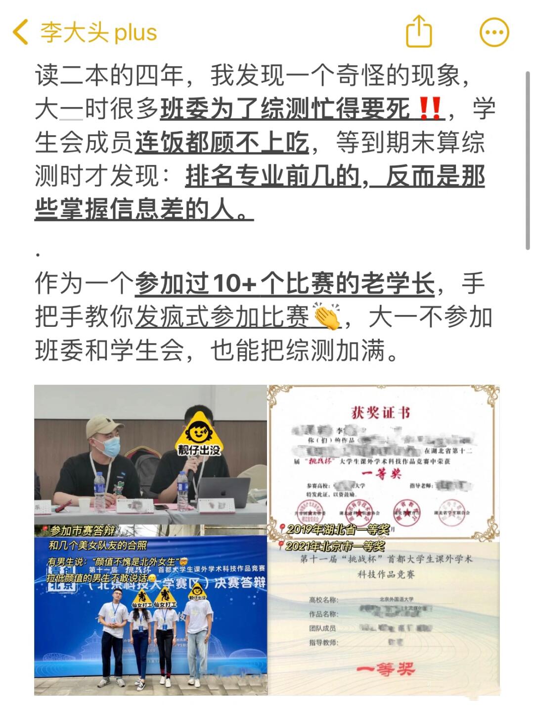 最近很多二本学弟学妹吐槽,自己班委竞选失败,看到身边人都有综测很迷茫怎么办?我的亲身经历告诉你,竞赛加综测分是班委的十几倍。我大一专业排89名,大二却用比赛综测前3、一等奖学金,大四靠挑战杯、大英赛拿奖保研,并在研究生复试拿到第1名✅