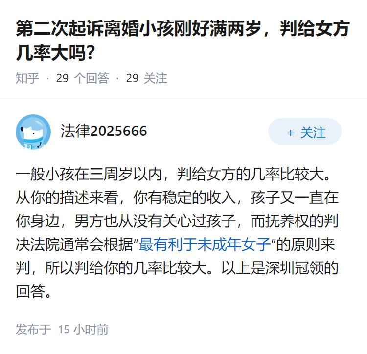 第二次起诉离婚小孩刚好满两岁,判给女方几率大吗?