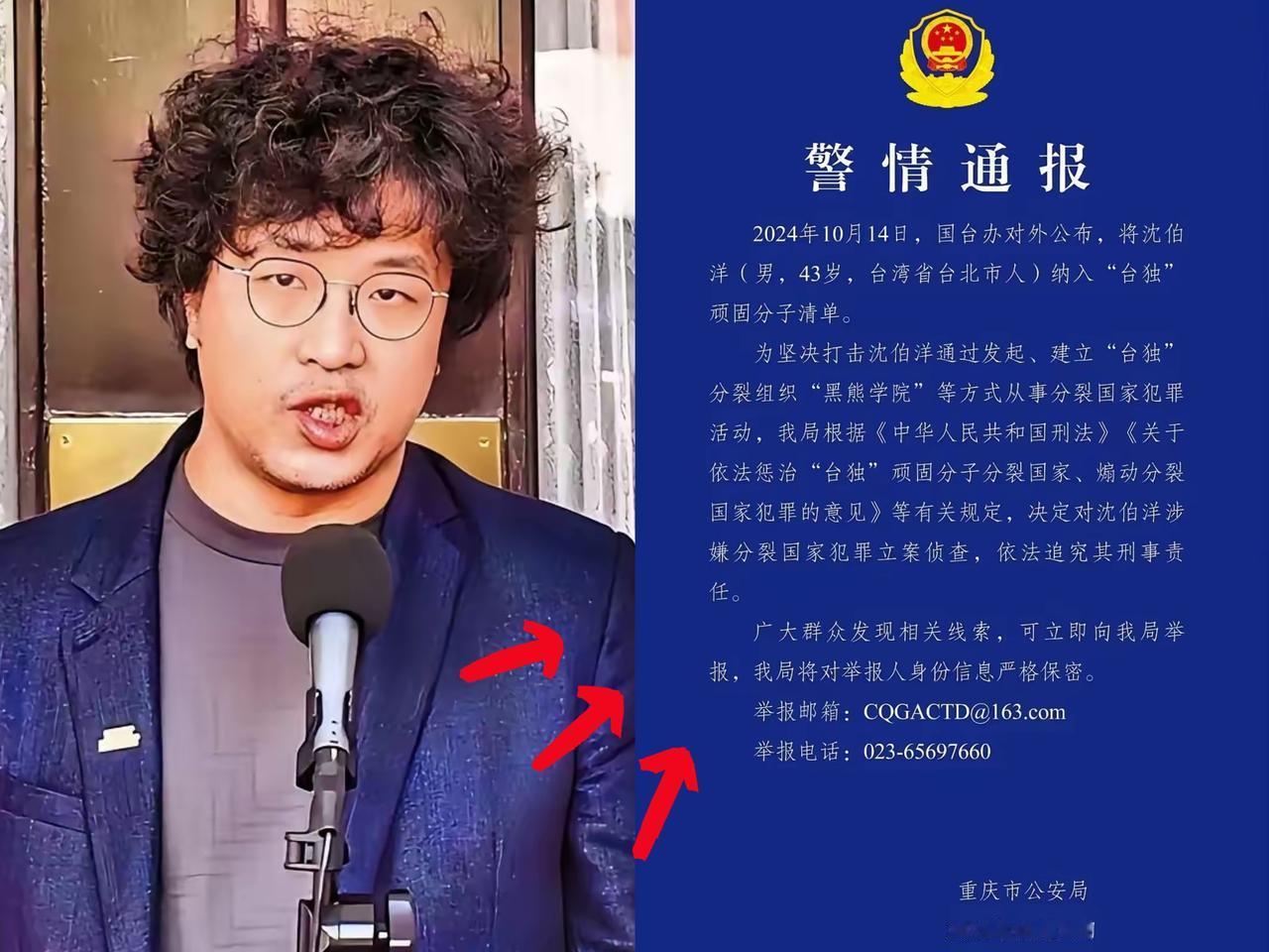 谁说大陆对台独迫害高安国将军之事无动于衷?今天,雷霆第一击来了。 重庆警方正式对“台独”顽固分子沈伯洋立案侦查,罪名叫分裂国家罪。这人可不是小角色,办所谓“黑熊学院”给年轻人灌“台独”毒汤,还打压两岸交流人士,早就劣迹斑斑 。 别以为之前进“台独”顽固分子清单只是警告,现在直接走司法程序,这是把反“独”从政治警示升级到了法律严惩 。他就算躲在外面也没用,立案了就终身追责,想跑都跑不掉 。 这哪是针对他一个人?分明是给所有“台独”分子划下红线:搞分裂不是闹着玩,法律账迟早要算。对岛内统派来说,这更是实打实的支持。 沈伯洋现在或许还嘴硬,但法律的威力他早晚会懂。你们觉得这招能震慑住那些“台独”跳梁小丑吗?
