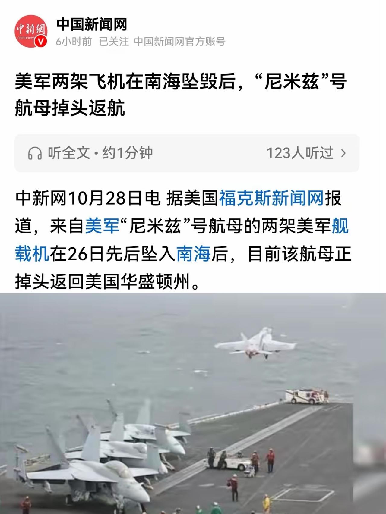 尼米兹号最终还是走了,根本不敢在原地逗留打捞坠海的战斗机。转头就往美国华盛顿州跑,这哪像个全球部署的航母,倒像怕被抓包的逃兵! 美媒28号才曝出来,26号这航母上先是“超级大黄蜂”坠海,接着“海鹰”直升机也掉了,好在5个人都救回来了,现在情况稳定。但你看美军那通操作,字里行间都在强调“全员生还”,这不就是典型的丧事喜办?明着是夸自己救援给力,实则是想把“战机连摔”的锅给盖过去,指挥官指不定还想靠这事邀功,抵消装备故障的过失呢! 更离谱的是特朗普,27号坐空军一号去东京的路上,张嘴就说事故可能是“劣质燃油”闹的。合着在他眼里,美军的装备问题、操作失误都不存在,更别提什么外部因素,反正只要他不承认,麻烦就像没发生过一样,这甩锅水平也是没谁了! 说真的,尼米兹号早就是艘老船了,这次灰溜溜回去,大概率等不到什么风光退役仪式。估计就是简单办个手续,然后拉到诺福克海军基地,要么拆成废铁,要么沉进海里,彻底从公众视线里消失。 你们觉得,尼米兹号这一撤,是真的怕了,还是单纯扛不住老毛病了?
