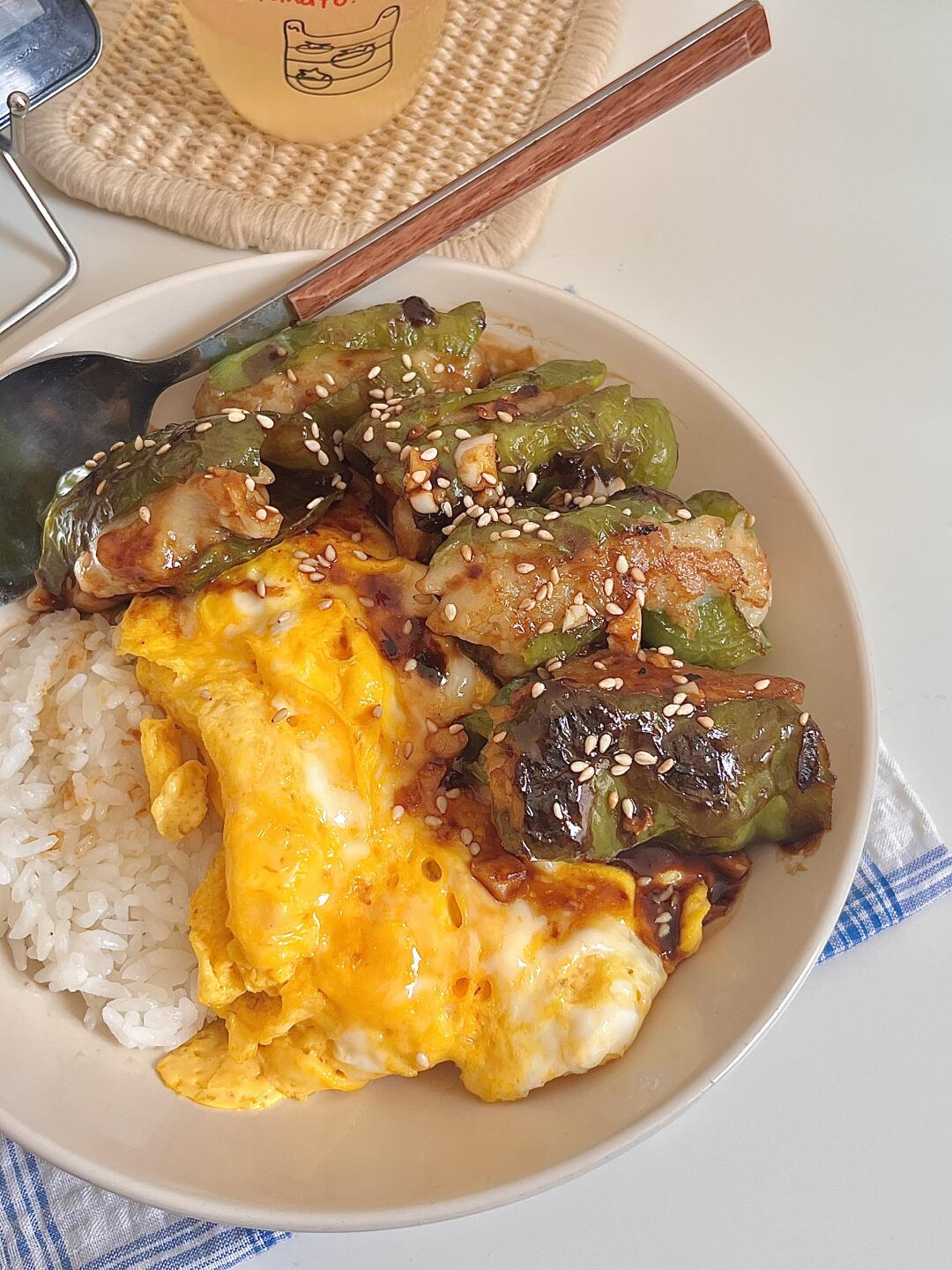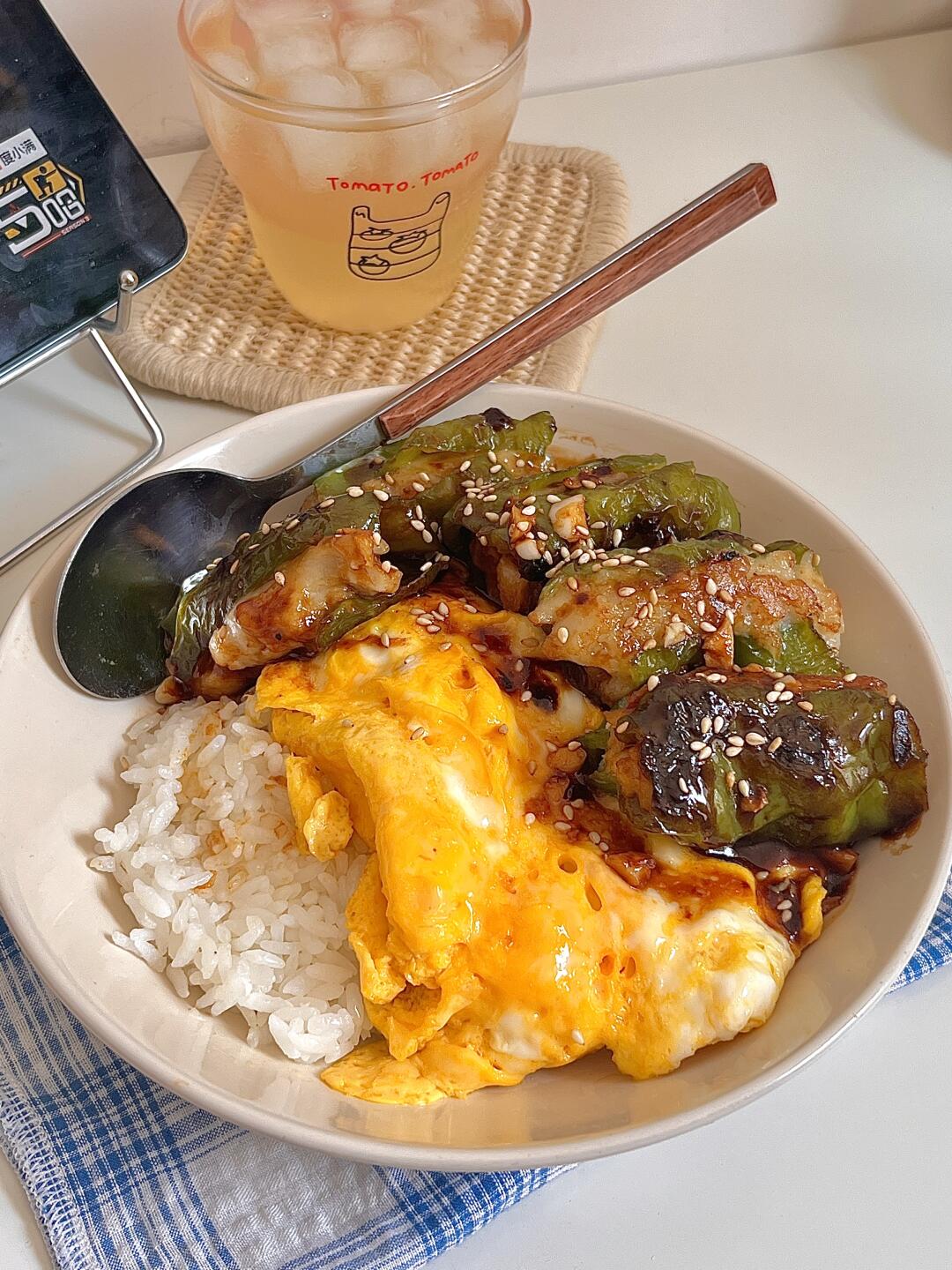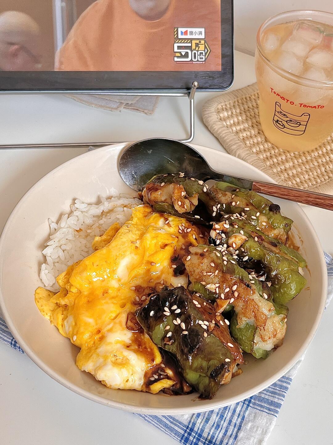 美食作者扶持计划 🍴今日份一人食: 青椒酿虾滑盖饭 滑蛋 苹果汁🧃 . 虾滑吃法,青椒裹着虾滑,虾滑q弹 青椒脆辣 巨好吃😋酱汁浇盖拌米饭真的香迷糊了~滑蛋鲜嫩搭配一起给我吃的满嘴香呀~爱吃的宝一定要去试试呀✌🏻