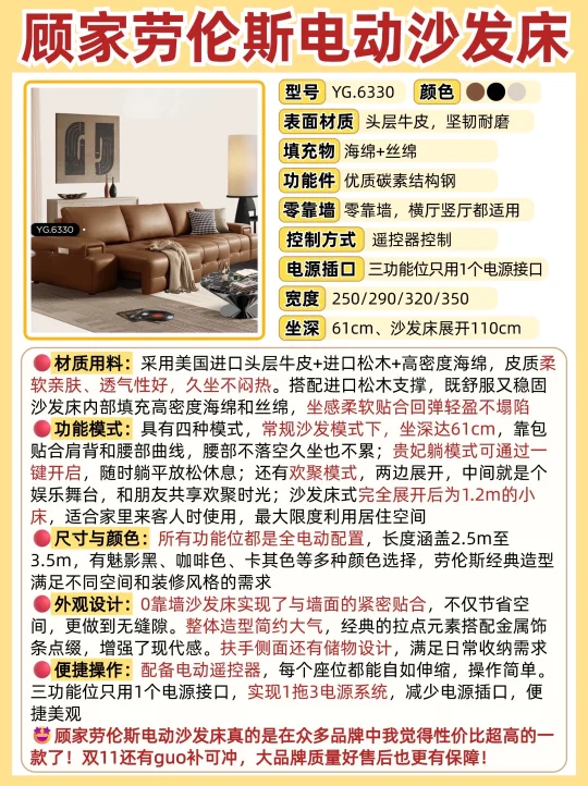 🌟所有功能位都是全电动配置,长度涵盖2.5m至3.5m,有魅影黑、咖啡色等多种颜色选择,劳伦斯经典造型满足不同装修风格需求
