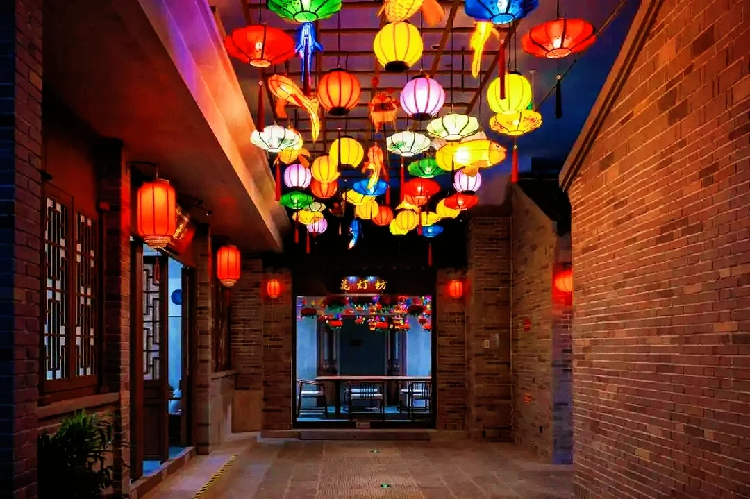 以清代六合县府街为蓝本复刻而成“非遗老街”,青石板路蜿蜒通向记忆深处,古韵悠然,骨牌灯、竹镇高跷表演、烙画、剪纸、雨花石雕刻、六合印社等交织在一起,构成一幅活态的非遗画卷。