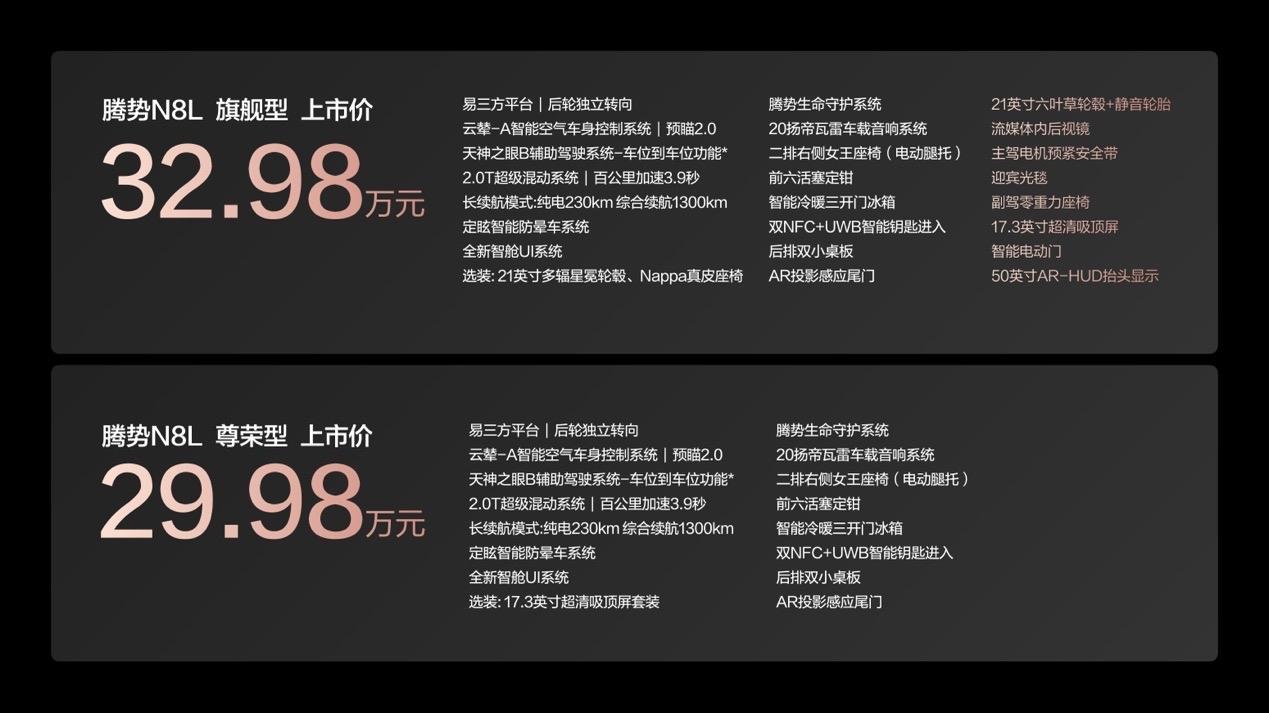 “超智能科技大座驾”腾势N8L 重新定义家庭豪华出行标杆! 家庭出行选车难?腾势N8L上市给出终极答案!29.98万起的“超安全家庭大六座”,以“五心体验 三感相伴”征服全家,更有至高10.67万元限时权益加持。 5.2米超长车身搭配“纯平车门”设计,一眼动心;套内6.11㎡空间实现“三排一样大”,1.8米成人久坐不挤,121°可调座椅配“迎宾模式”,老人小孩轻松上下车,舒心满分。 3.9秒零百加速与35.4米刹车距离随心掌控,4.58米同级最小转弯半径让窄路调头自如,230km纯电续航通勤一周一充,1300km综合续航告别里程焦虑,全程省心。 2000MPa热成型钢车身扛住25吨压顶,9气囊加180km/h爆胎稳控等硬核防护,不愧“安全之王”,全家安心。 11L冷暖冰箱、17.3英寸吸顶屏配帝瓦雷音响,“零甲醛”座舱加防晕车系统,联动智能家居与儿童安全装备,暖心满格。 从日常通勤到全家远游,腾势N8L用安全、豪华与智能,成为家庭出行的全票之选!