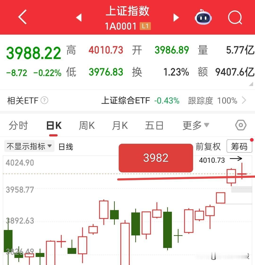 又要开盘了,今天如何应对呢? 昨日盘中一度缩量2600亿,下午跳水成交量一度放量近1000亿,尾盘企稳后成交量又再次缩量300亿! 从量能来说,跳水放量是因为获利盘跑路并且踏空资金入场,从跳水的形态来看,应该又是量化设定的程序,到了4000点就开砸! 从尾盘来看,昨日承接还是不错的,量化没能砸下去,那就说明多空旗鼓相当,都在等待今天的走势! 那么今天我们只需要关注做多点位3982点,这里就是短线资金出局的一个坎,跌破这里不能收回,短线资金大概就要跑路了,如果不跌破这里,那就还有戏,只要今天能反包昨天阳线,将会继续上涨! 港股休市一天,今天的量能会受到影响,那么就看内资愿不愿意在外资休息的时候继续拉一把,让他们来追高了 纯短线思路,中线忽略,4000点不是顶,只是腰! 盘中再聊吧!