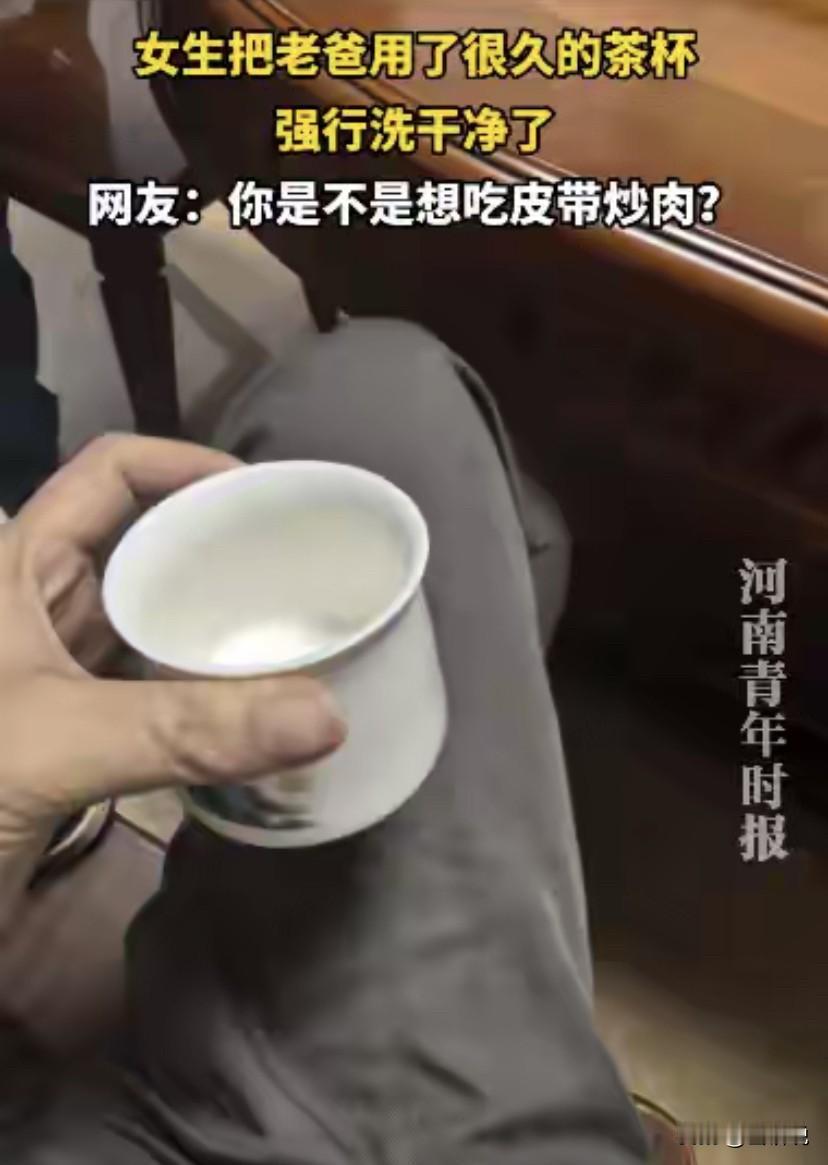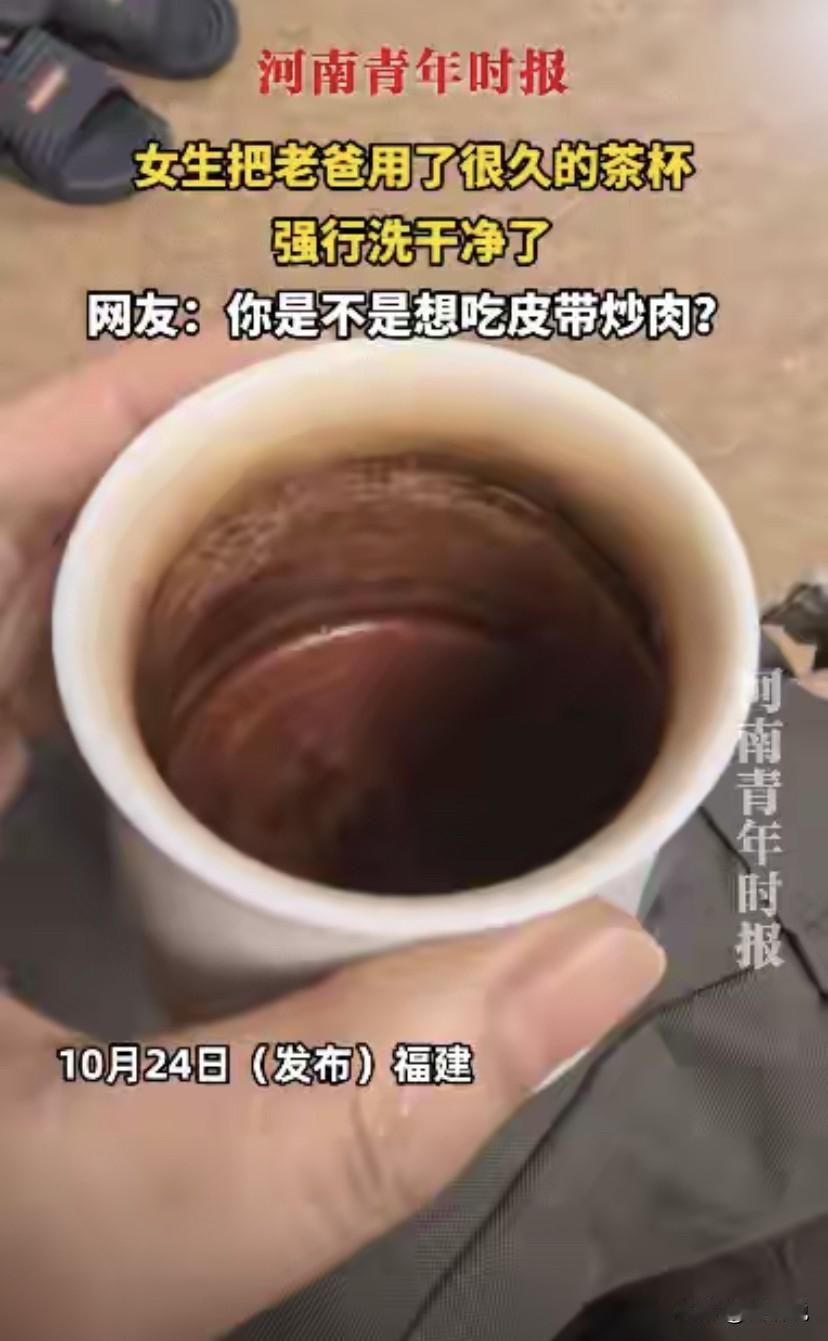 福建,一个女孩看她爸爸的茶杯用了好久都没洗,里头茶垢积了厚厚一层,实在看不下去,就花了好大力气,把杯子刷得干干净净。没想到视频发出来,评论区一片“完了,女儿要挨打了” 很多人不理解,一个杯子而已,洗干净不是应该的吗?但对很多爱喝茶的长辈来说,那层茶垢还真不是脏东西,那是时间养出来的,是喝茶人自己的“战绩” 那个女孩说,杯子本来是白色的,现在里外都是茶渍,她作为女儿真的忍不了。可父亲不这么想,那是他喝了好久才养出来的,是资历的证明 这事有意思的地方就在这儿:你觉得是为他好,他觉得你在坏他的好事 这其实不只是茶杯干不干净的问题,是两代人对“习惯”和“记忆”的不同理解。老一辈人常觉得,用得久的东西有感情,那层茶垢像是岁月的包浆,是陪伴的痕迹。年轻人更在意卫生和整洁,看着黑乎乎的杯壁,第一反应就是得刷干净 类似的情况也挺常见。比如我妈总爱收着那些看起来没什么用的塑料袋,说以后能用上;我非要给她扔掉,换新的。她觉得我浪费,我觉得她将就。谁对谁错?好像也说不清
