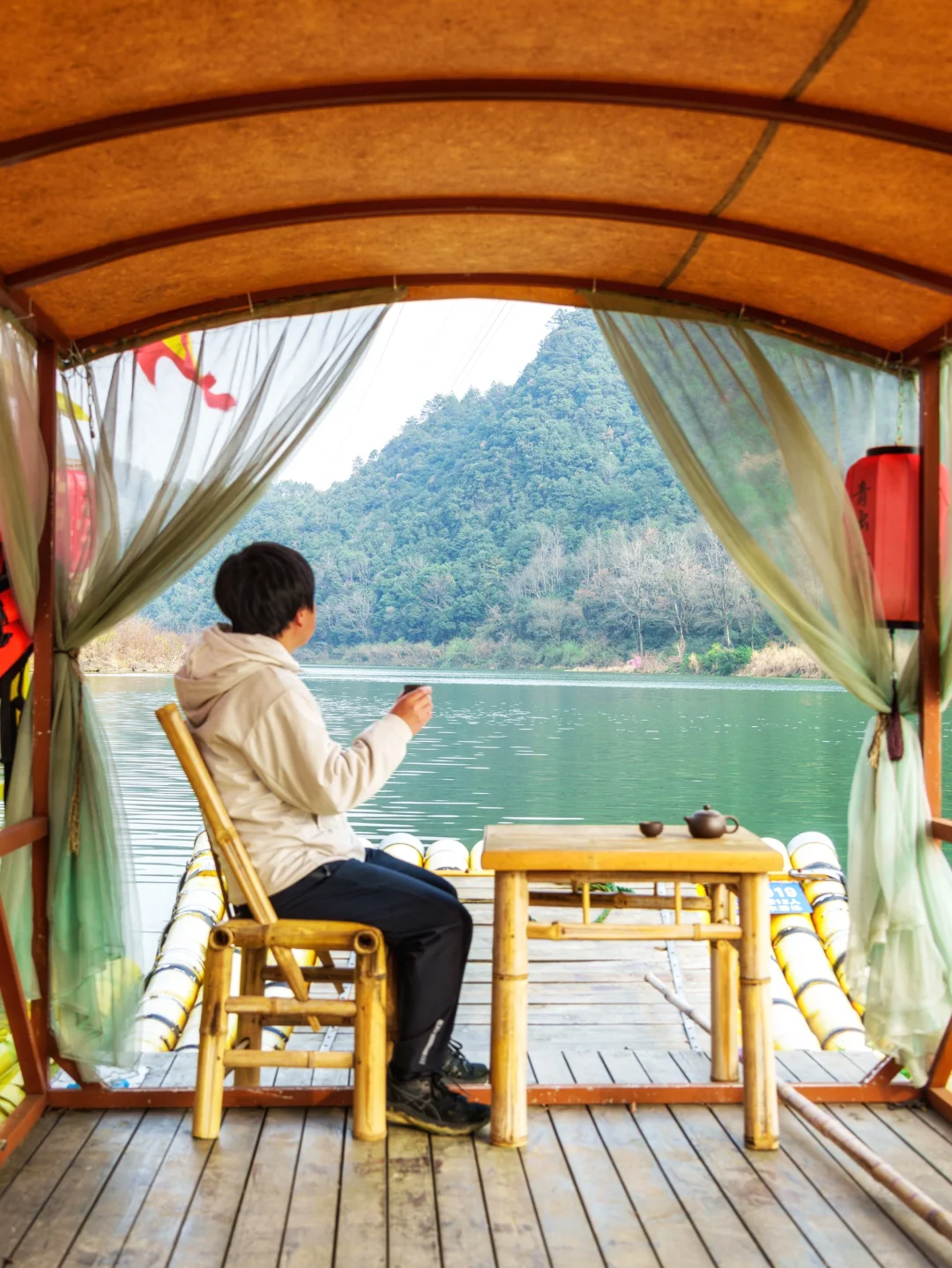 不用湿身的休闲漂流,在竹筏船上,感受天目溪景色,运气好还能碰上白鹭在江上起舞