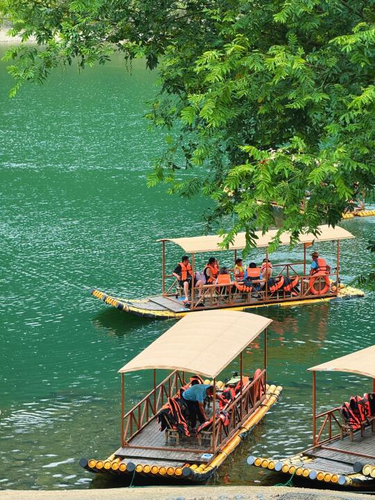 不用湿身的休闲漂流,在竹筏船上,感受天目溪景色,运气好还能碰上白鹭在江上起舞