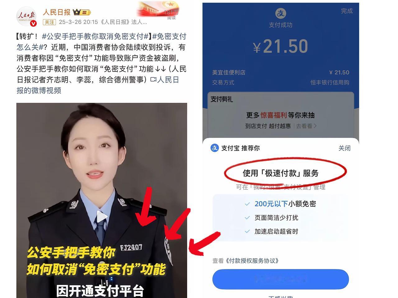 投诉支付宝!! 包括人民日报在内的多家媒体和公安部门都提醒大家为避免资金损失,要关闭免密支付功能。但是支付宝付款后就弹窗逼你开,这操作真的太膈应人了! 弹窗里“同意协议”几个大字又蓝又显眼,还得常按确认,反观“不感兴趣”小得快要看不见。这不就是故意挖陷阱吗?手一滑就中招,后续真被盗刷了,维权都费劲 。 支付宝自己说要保障用户选择权,可这诱导式弹窗根本没给人选的余地。便利不该靠“套路”实现,安全也不是只靠“被盗全赔”的口号兜底。平台要是真为用户好,就该把选择权还给大家,而不是玩这种文字游戏。