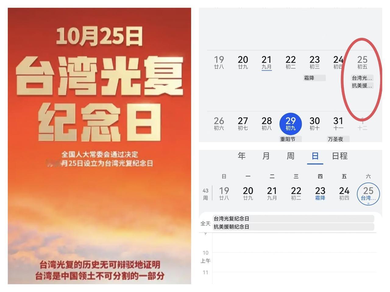 很久没有看日历了 无意中突然看到日历上的10月25日上显示了——台湾光复日 很多人不知道是什么意思 其实就是我们心里希望的那个意思。 光复可不是我们传统常见的用语 光复节也不是第一次 宝岛早而有之 所以不必去猜哪一天,哪一天都是良辰吉日! 你我必会亲眼所见什么叫光复 台湾必回祖国怀抱