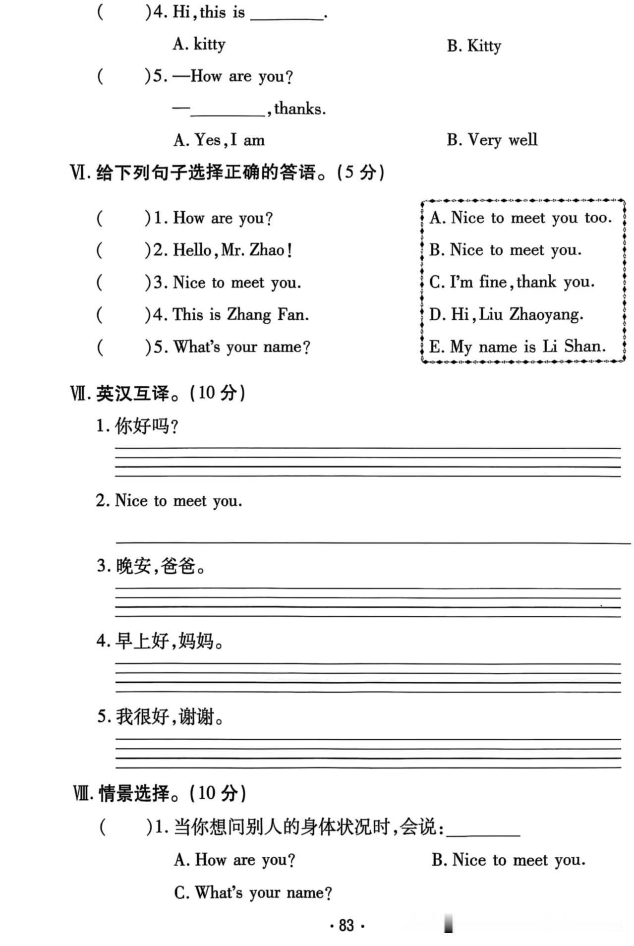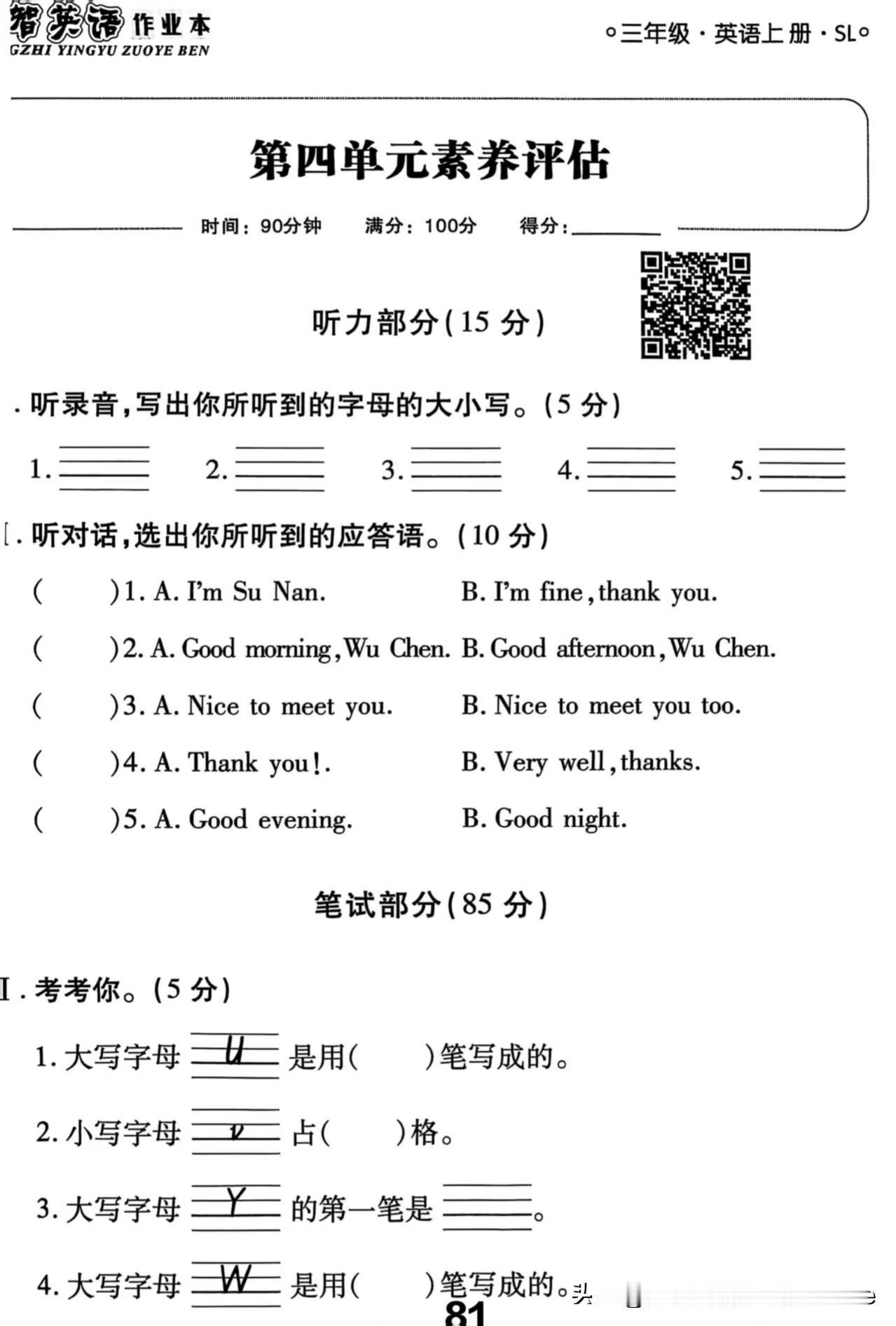 今日份分享: 小学陕旅版三年级上册英语单元过关——第四单元在这个单元里,有着丰富又实用的英语知识。本单元聚焦于动物相关的词汇和表达。像“cat(猫)”“dog(狗)”“monkey(猴子)”等可爱动物的英文单词,都在这一单元闪亮登场。 孩子们不仅要记住这些单词的拼写,更要学会在实际情景中运用它们。单元里的对话练习就很有针对性,模拟了在动物园、宠物商店等场景下,如何用英语去描述和谈论这些动物。 对于家长和老师来说,帮助孩子掌握这一单元知识也有不少小窍门。可以通过制作动物卡片,一面写英文单词,一面画对应的动物图案,让孩子进行记忆和识别。还能利用一些英语儿歌,欢快的旋律会让孩子更快地记住单词发音。 希望孩子们都能顺利通过这个单元的学习,在英语的世界里和这些可爱的动物们成为好朋友!