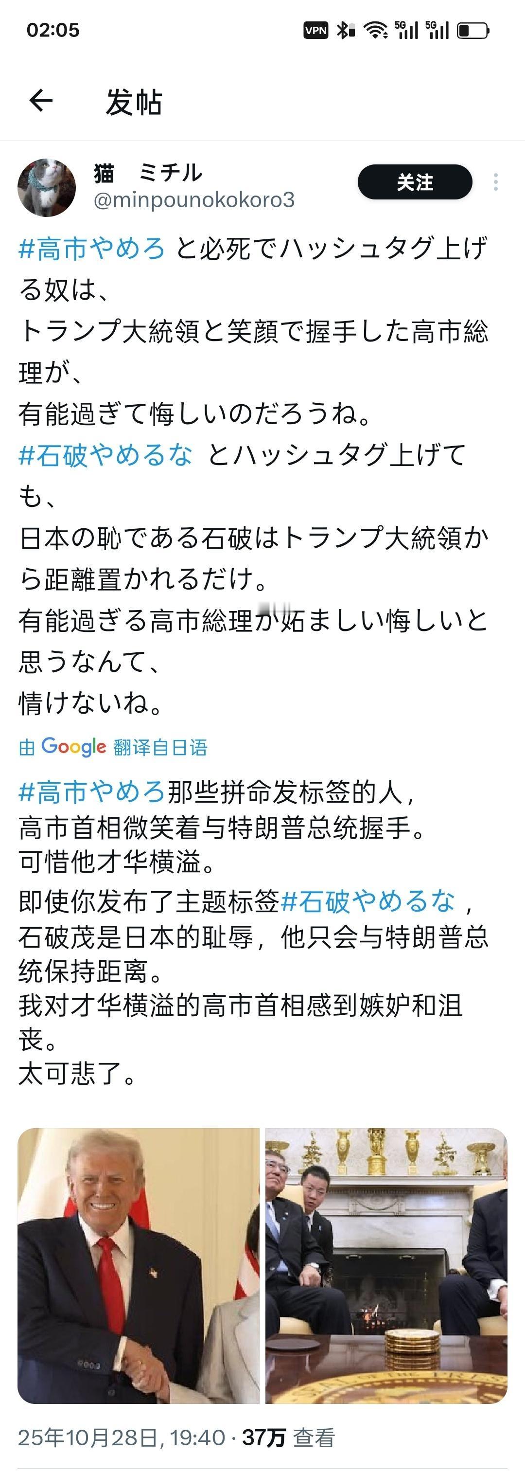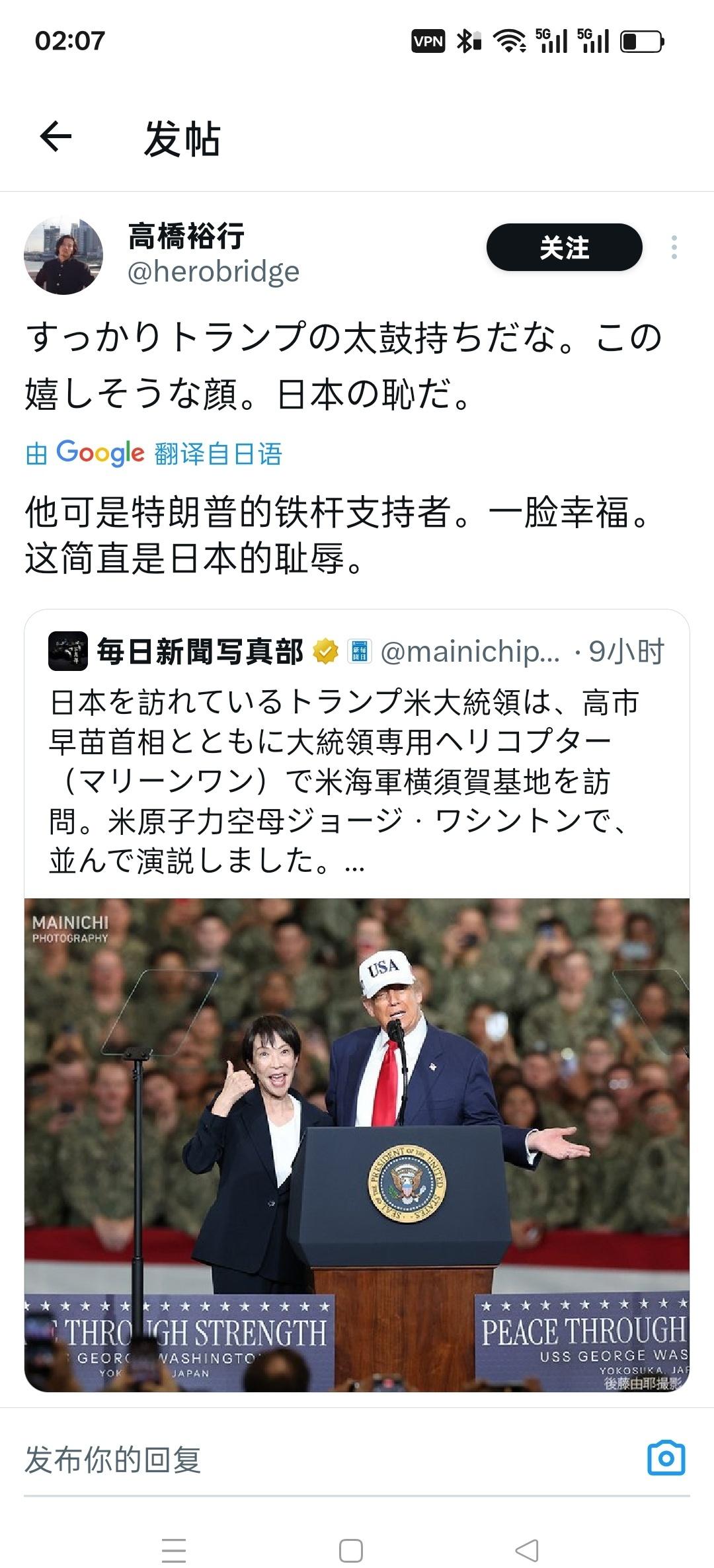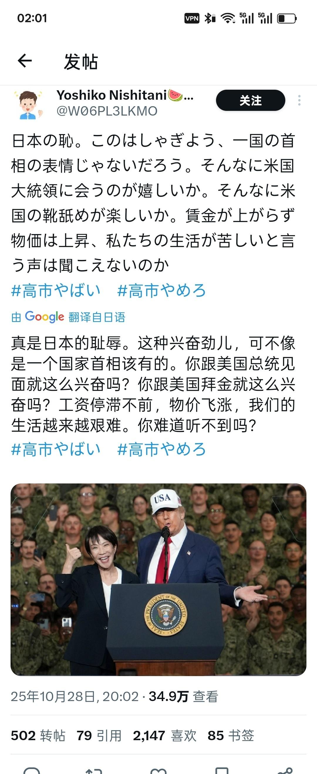 打开X切换成日本ip,结果热搜榜首是「日本之耻」,是因为日本新首相高市早苗与特朗普合影时表现得过于兴奋,不像一个国家首相的样子,更像特朗普的迷妹